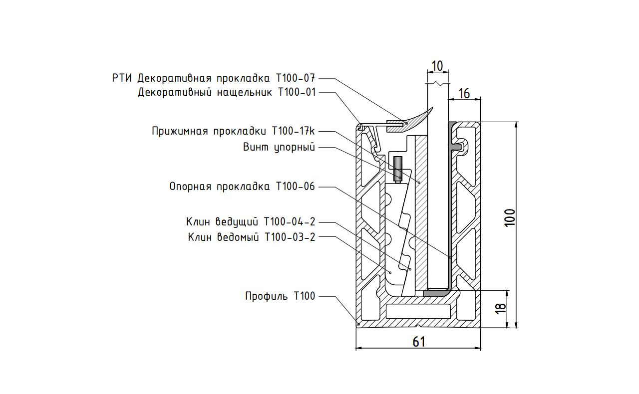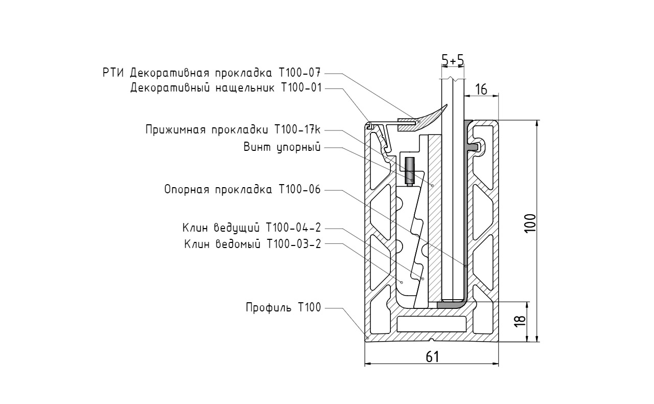 Конструкция данных зажимных систем существенно отличается от существующих на рынке. Основным техническим решением в данных системах — стало увеличение высоты прижимного клина. В аналогичных профилях, что уже существуют на рынке, высота прижимного клина 50-55мм, тогда как в профиле т100 — 80 мм. Также одной из главных особенностей профиля т100 является возможность применения стекол 20мм и триплекса 10+10мм, чем не могут похвастаться прочие аналоги алюминиевых профилей.  Крепежные отверстия гарантирует более удобную и быструю установку профиля на объекте, это уменьшает время и затраты на монтаж.