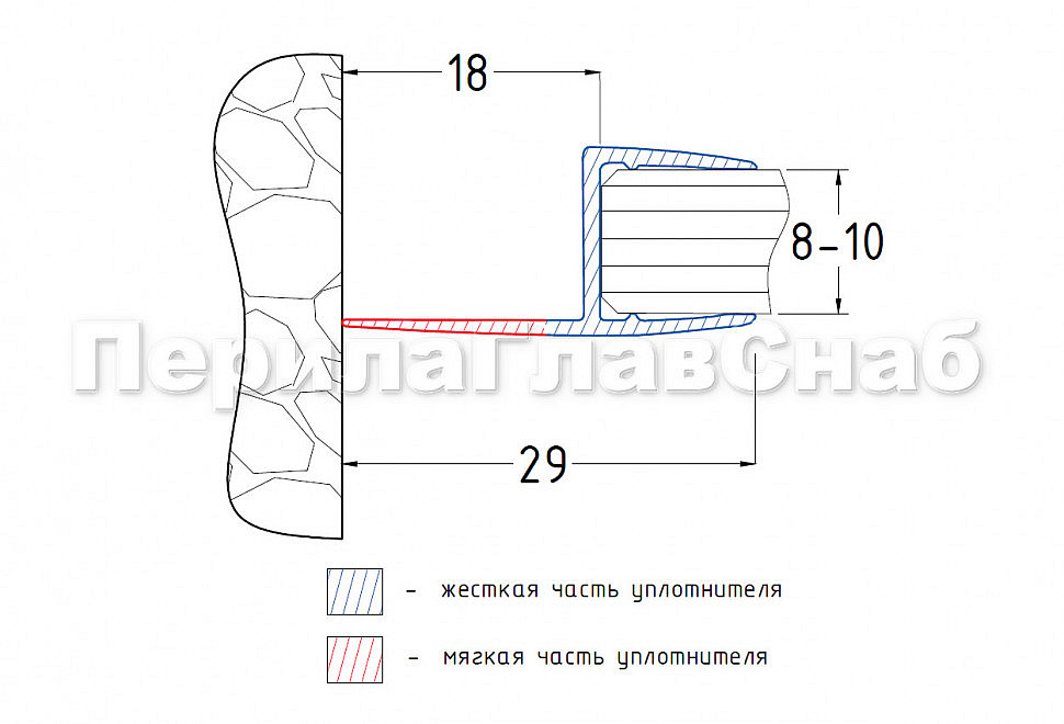 Уплотнитель имеет исполнение прозрачной поверхности, выполнен из материала ПВХ. Имеет Ч-образный профиль. Толщина одного типоразмера составляет 1.5 мм, длина – 2200 мм. За счет своих свойств (стойкость к щелочам, минеральным маслам и многим кислотам) прекрасно подходит для крепления стеклянного листа по всему периметру. Позволяет соединять стеклянные панели между собой. Он применим в сочетании со стеклом толщиной до 8 мм и углом в плане до 1800
