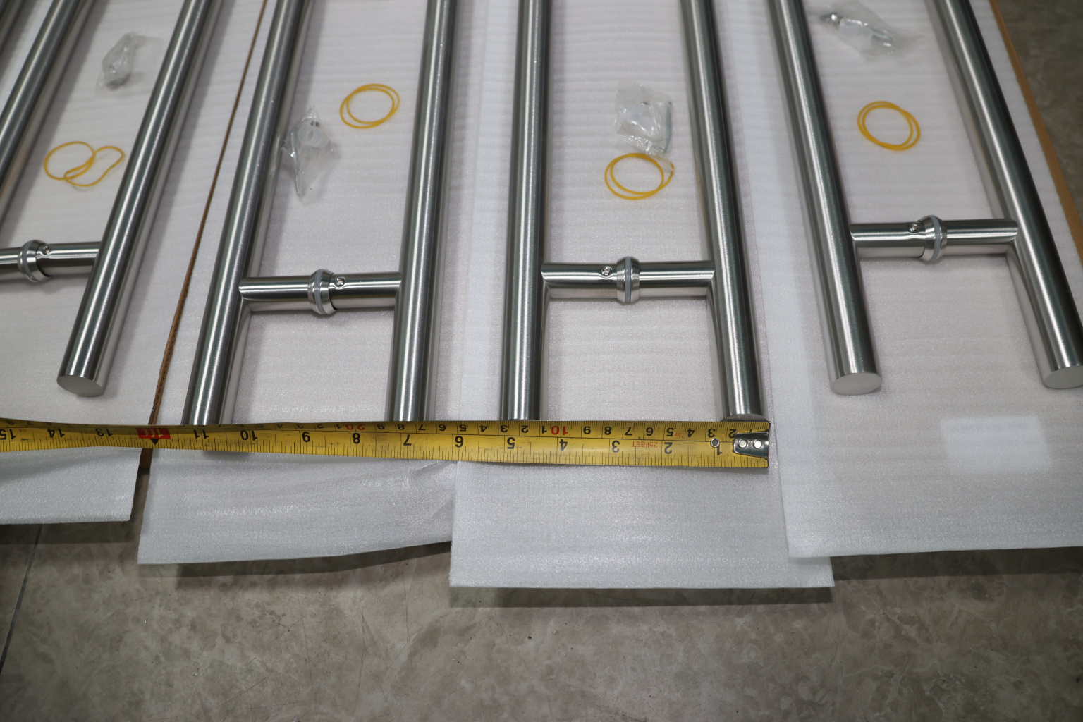 у основания ручки откручиваем с помощью шестигранника винты, делим ручку на две части, в заранее заготовленные отверстия вырезы в стекле 10-12 мм фиксируем первую часть ручки в отверстиях и с обратной стороны ответную часть затягиваем с помощью шестигранника