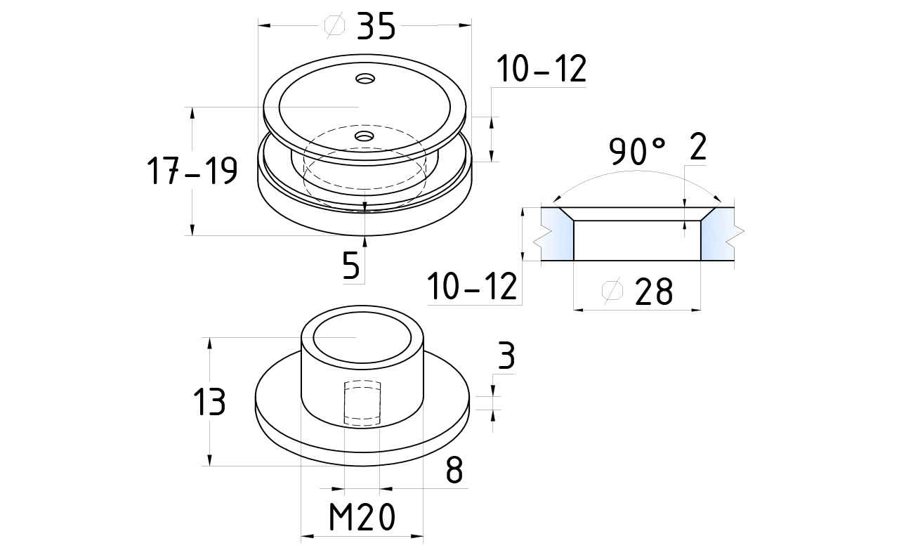 точечное крепление 8.5-10.5 мм, c зенковкой, для стекла 10-12 мм, шлифованное. Марка стали - AISI 304
