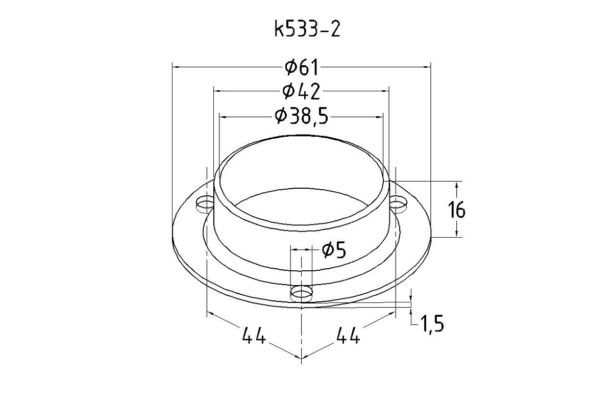 Это самый дешевый фланец под поручень Ø38.1 мм. Дешевле вы не найдете! Низкая цена обусловлена тем, что деталь выполнена методом штамповки, где толщина стенки 1.3 мм. Литой аналог данной позиции k033.