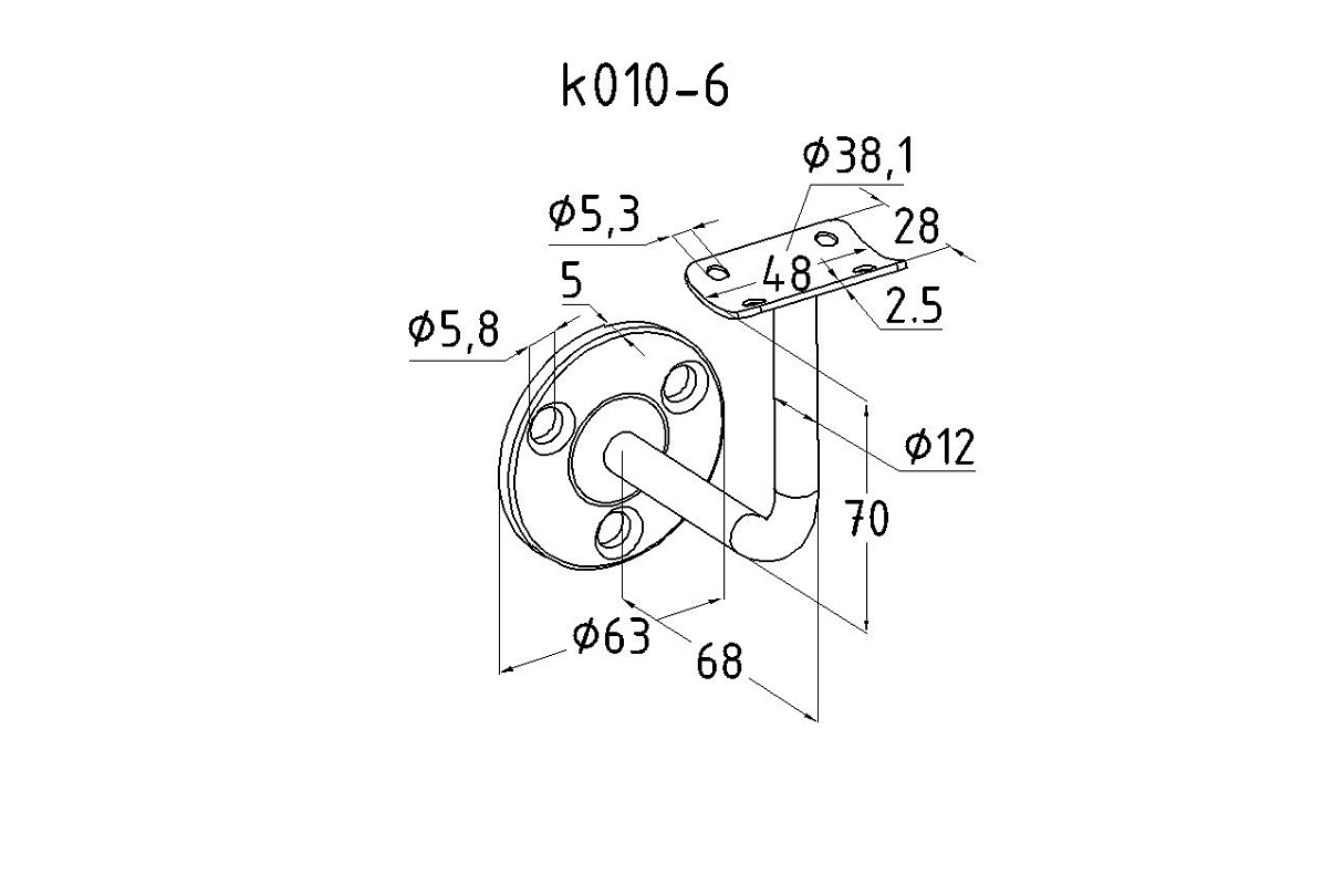 Благодаря оптимально подобранному выносу, пристенный поручень достаточно удален от поверхности стены, чтобы не задевать скользящей вдоль трубы поручня рукой идущего по лестнице человека. Но при этом поручень располагается близко к стене, дабы не сужать свободное пространство полезной ширины лестничного марша. Габариты: вынос 68х70мм, Ø63х85мм, ложемент 28х48мм