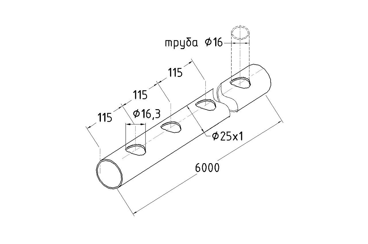 Труба из нержавеющей стали AISI 304 диаметром 25 мм и толщиной стенки 1 мм, длиной 6 метров. Имеет перфорацию Ø12 мм под углом 90°. Надежна, устойчива к коррозии, не требует дополнительной окраски или обработки. Применяется в сборных системах перил для жилых и коммерческих объектов.