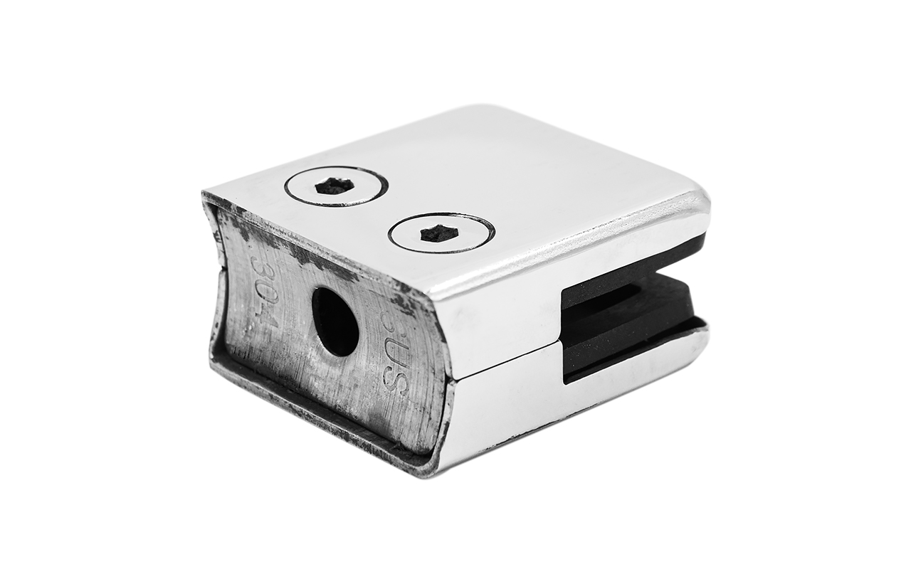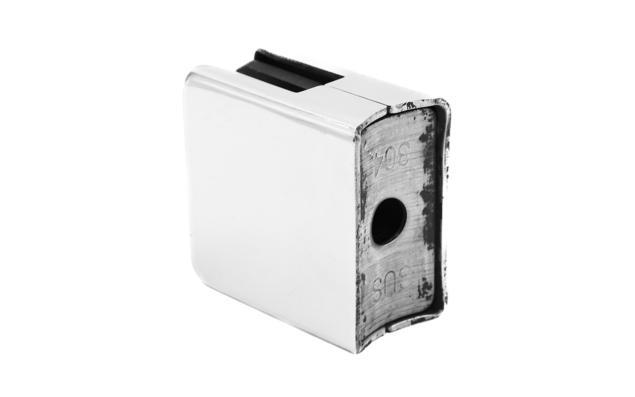 Стеклодержатель штампованный, под стекло 10 мм (5+5 мм), квадратный под стойку Ø38.1 мм (40х24х48 ) полированный AISI 304 k351-10