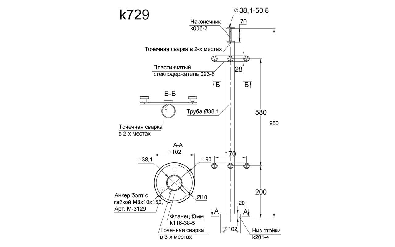 Стойка изготовлена на нашем производстве и готова к установке сразу после покупки. Используемая при изготовлении 304 марка стали позволяет применять данную стойку как внутри здания, так и на улице. Особенно это важно для людей, которым важно сделать свои ограждения в одном стиле как внутри здания, так и снаружи. Все элементы стойки приварены аргонной сваркой, благодаря чему фланец с 3-мя отверстиями для крепления в пол и наконечник под трубу ф38-50 составляют единую конструкцию со стойкой. Достаточно ослабить винт, что бы изменить угол наклона пластинчатого стеклодержателя при помощи шестигранника и затем зафиксировать в нужном положении. Сварные швы на балясине убраны и идеально заполированы, а балясина ничем не уступает ограждениям сделанным профессиональными бригадами. Любой человек сможет сделать монтаж имея только отвертку, клей( ф-1127, ф-1105) и саморезы ( М-3850, М-3847, М-3215), шестигранник ( k931, k932) и анкер-болты( М-3129, М-3843, М-3838). В стеклодержатель можно установить стекло от 6 до 12мм. За счет выноса держателей стекла можно использовать сразу двухметровые стекла, а стекла будут с минимальным зазором. Что создаст эффект цельности всего ограждения. За счет цельности стекла данные стойки применяют в торговых центрах и для балконных ограждений, потому что они обеспечивают защиту от падения сквозь них, а при применении на улице создают щит от ветра.