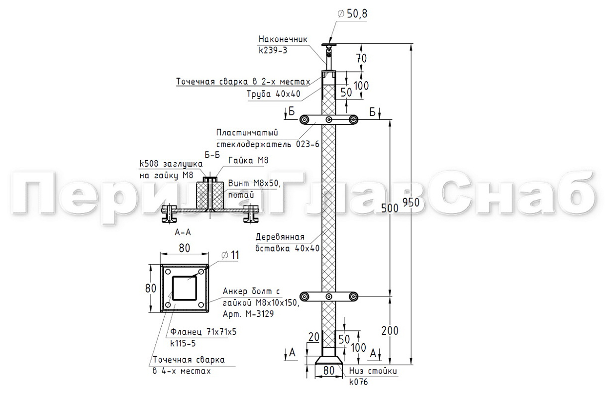 Готовая стойка 40х40х950 мм, деревянная, со вставками из нержавеющей стали 2х100 мм с 3 ригеледержателями k740-1-G купить в Омске