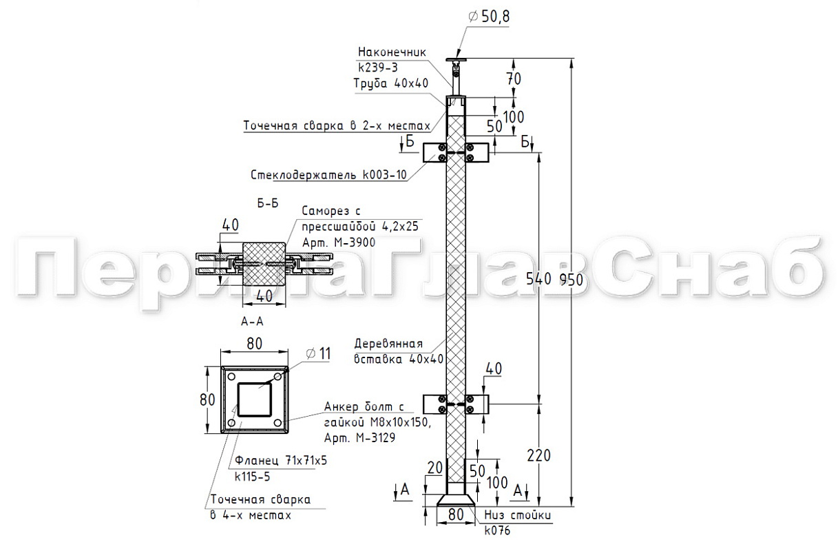 Стойка квадратная 40х40: 4 литых стеклодержателя, шлифованная, высота 950 мм AISI 304 k746-7 купить в Омске