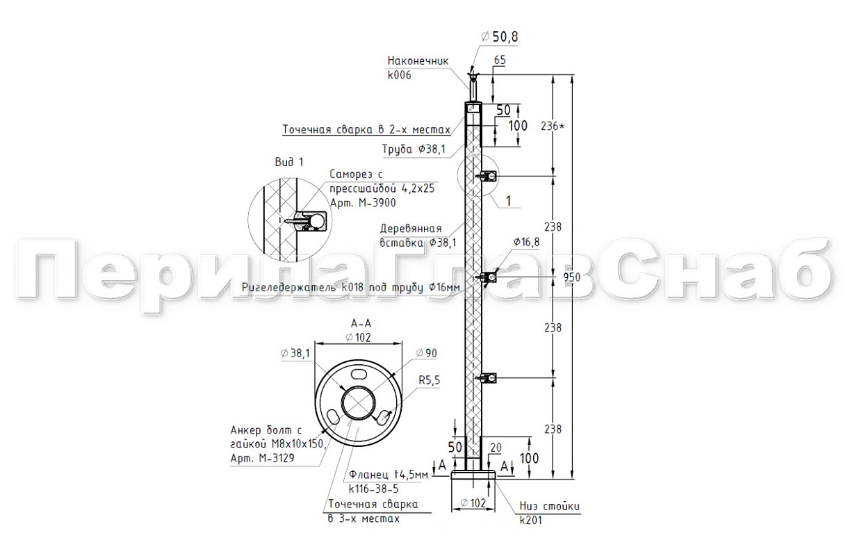 Готовая стойка Ø38,1 мм, с фланцем и наконечником, высота 950 мм, полированная (AISI 304) k702 купить в Омске