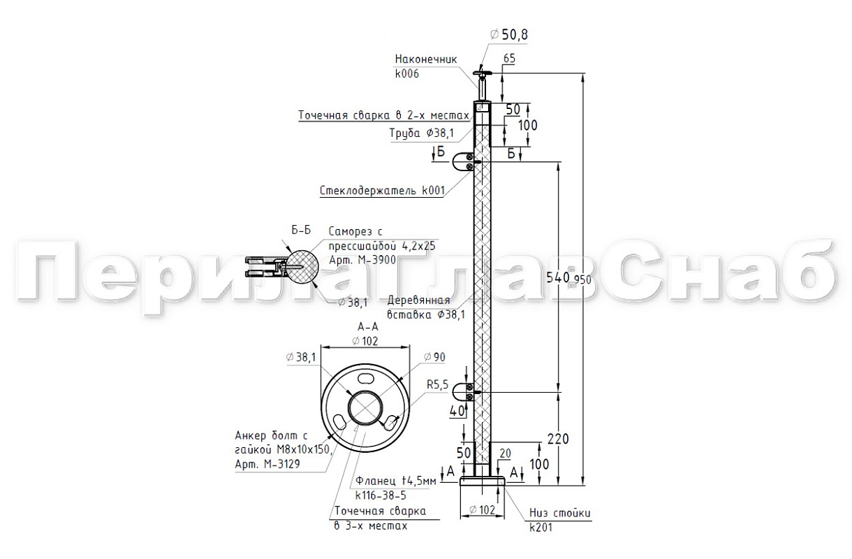Готовая стойка Ø38,1 мм, с фланцем и наконечником, высота 950 мм, полированная (AISI 304) k702 купить в Омске