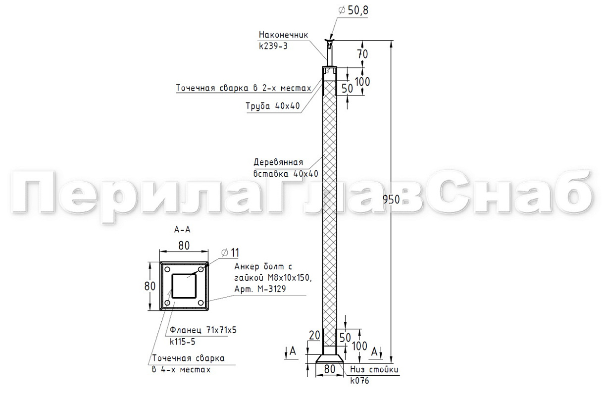 Готовая стойка 40х40х950 мм, деревянная нелакированная, дуб, с лежементом под плоскость, со вставками из нержавеющей стали 2х100 мм k740-12 купить в Омске