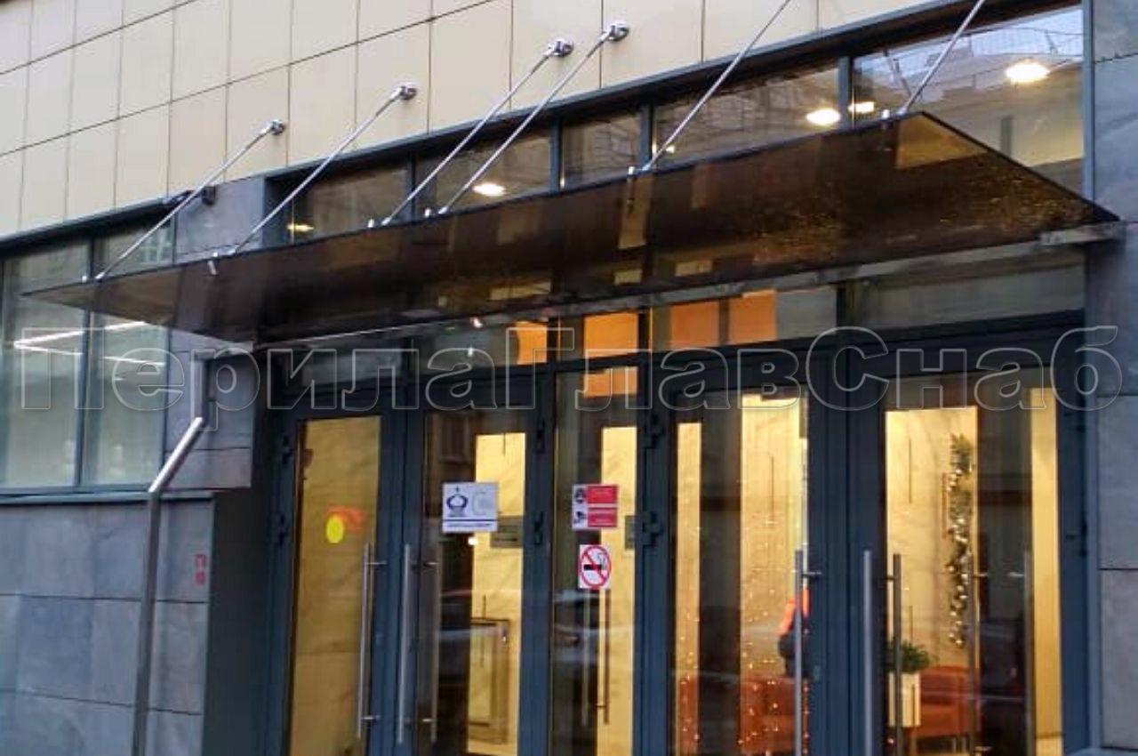 Что повлекло за собой немедленную потребность в защите входных групп от атмосферных осадков в виде стеклянных козырьков. По заданию заказчика было разработано и воплощено в жизнь сложное конструктивное решение. Срок выполнения работ составил двадцать пять рабочих дней. Наша компания установила под ключ четыре козырька разного размера. Общая площадь составила более двадцати семи квадратных метров. Стоимость кв. метра 76 758,00 руб. В данной работе использован многолетний опыт и нестандартный подход инженеров-конструкторов нашей компании, было применено и реализовано следующее уникальное решение: контор уклон козырьков к стене, это значит, что при дожде вода будет скатываться по стеклянной поверхности в сторону стены и далее попадет в водоотвод (специально для зимних условий мы поместили нагревательный элемент в водоотводную систему, что позволило не собираться снежным шапкам на наших козырьках, тем самым снизили нагрузку на стекло в снегопады). Еще одну нестандартную особенность нам пришлось исполнить, если верхнее крепление козырьков стандартное для отрасли (вантовое), то нижний крепеж необходимо было размещать на витражах входных групп со специальным креплением в профиле самого витража, что -бы достичь оптимальной высоты козырьков над головой гостей и сотрудников БЦ. В данной работе применили закаленное стекло триплекс 8+1+8 мм тонированное в массе бронзового цвета. Все нержавеющие элементы - составляющие детали козырька собственного производства и аналогов по качеству на рынке нет.