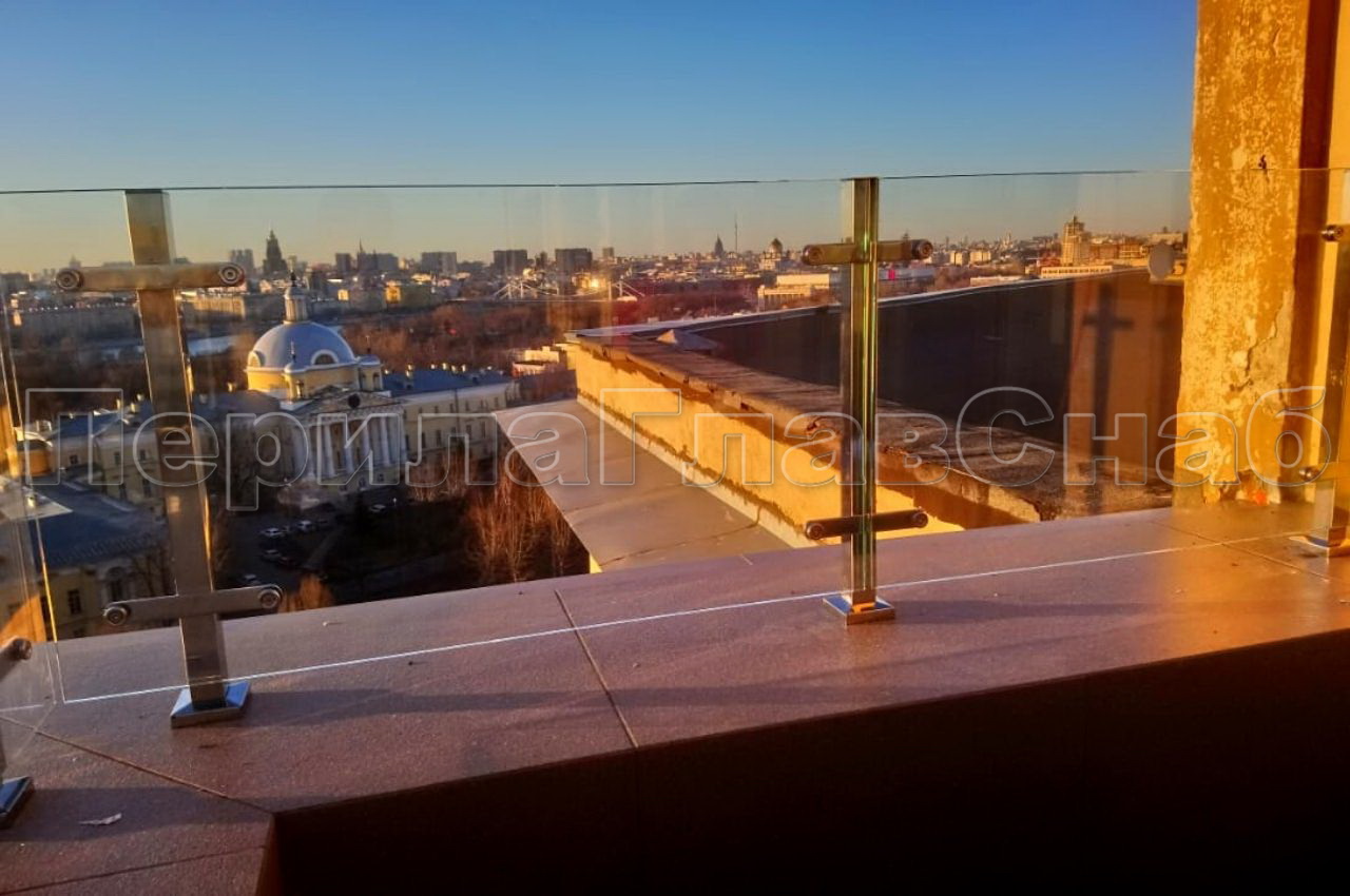 На Ленинском проспекте в многоквартирном жилом доме на последнем этаже было установлено ветрозащитное ограждение. Клиент дал задание сделать максимально легкое и прозрачное ограждение, чтобы любоваться открывающимися прекрасными видами на Москву. Высота стекла с учетом парапета была подобрана таким образом, чтобы ветер не попадал на клиента стоящего на балконе. Монтажная бригада выполняла установку двадцати двух метров погонных перил на высоте четырнадцатого этажа. Стойки ограждения углублены в бетонное основание парапета на глубину 200 мм для повышенной жесткости конструкции. И расстояние между стойками имеет нестандартные 1600 мм. Это было просчитано инженером по нагрузкам в индивидуальном порядке. Необходимо думать о безопасности людей проходящих внизу. Стеклодержатели были подобраны из каталога ПерилаГлавСнаб специально для таких видов работ. Они приварены к стойкам аргонно-дуговой сваркой и держат стекло через сквозные отверстия в нем. Стекло оптивайт идеально вписалось в данный проект, отвечая запросу заказчика. Имея более прозрачную структуру и голубые кромки. Были небольшие трудности с такелажными работами в связи с габаритами стекла. Они просто не входили по размеру в лифт. Но для компании ПерилаГлавСнаб нет ничего невозможного. Стекла подымались по лестничным маршам с особой осторожностью не нанося урон. Стоимость погонного метра данного вида ограждения 27 800 руб.