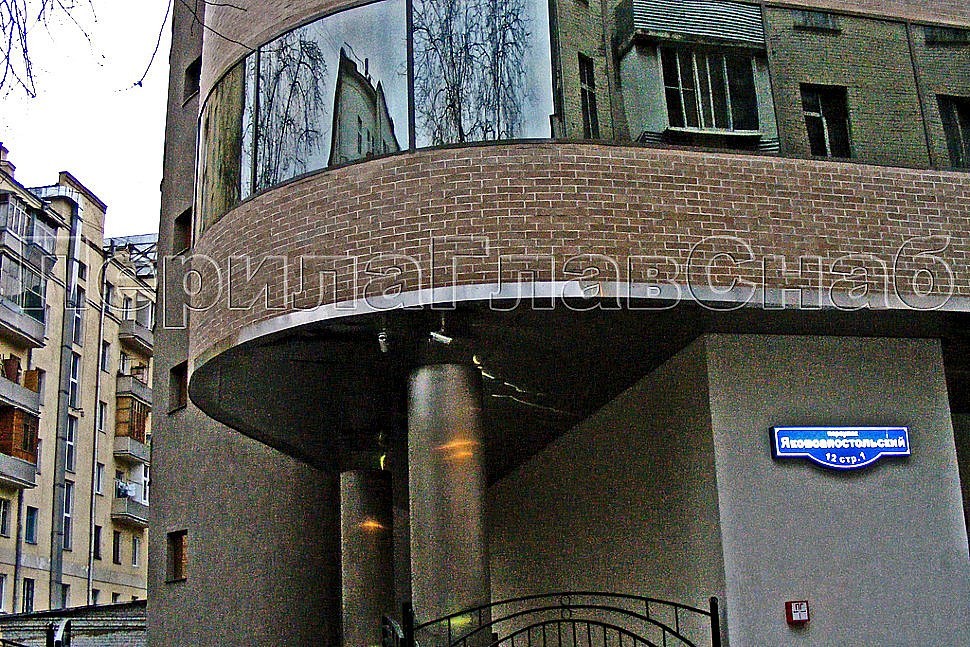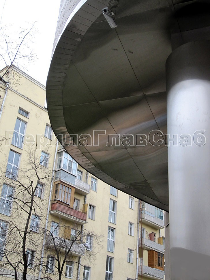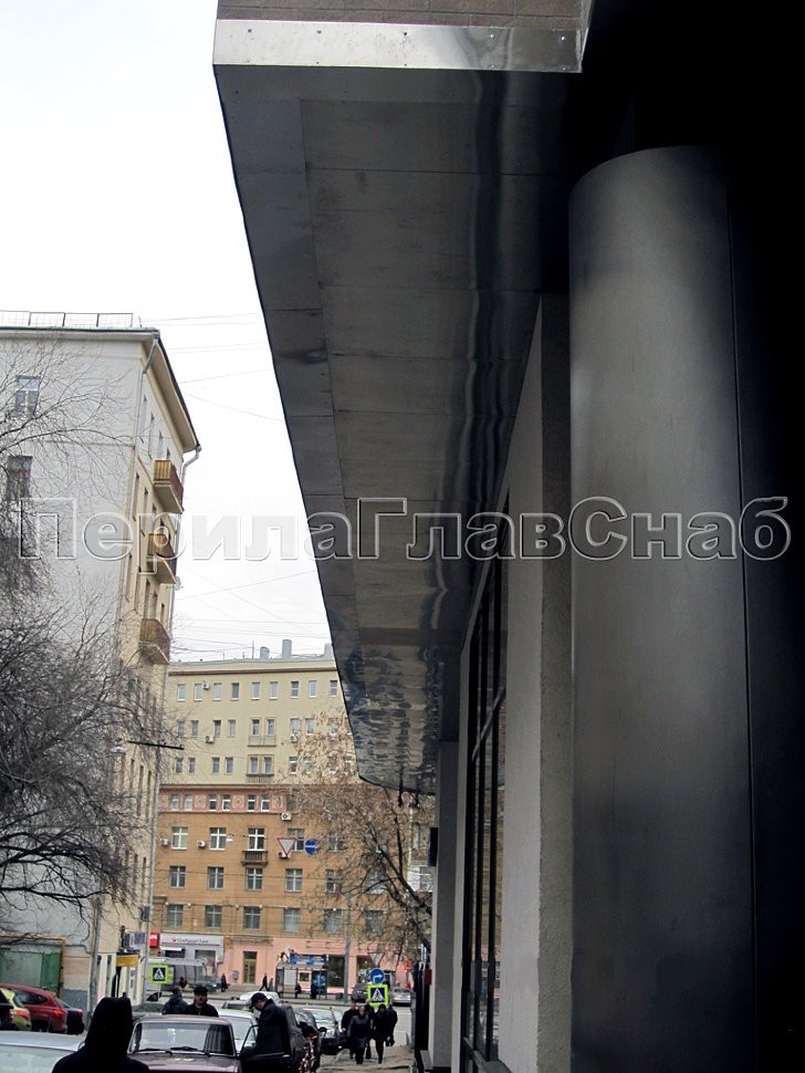 На фасаде здания бизнес центра была произведена облицовка балюстрады первого этажа нержавеющей сталью.