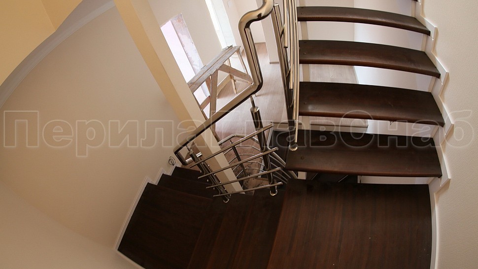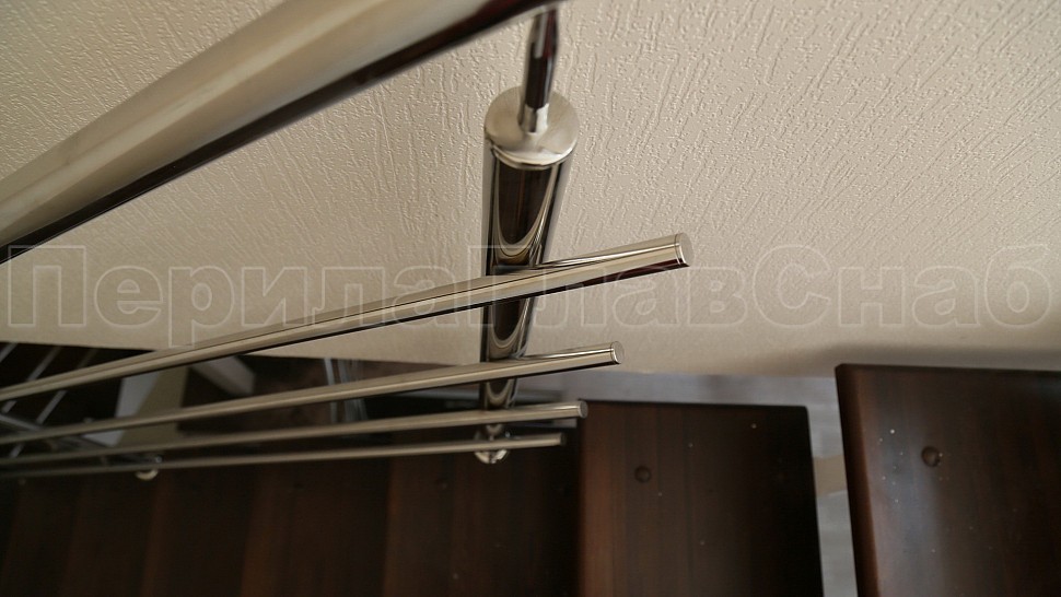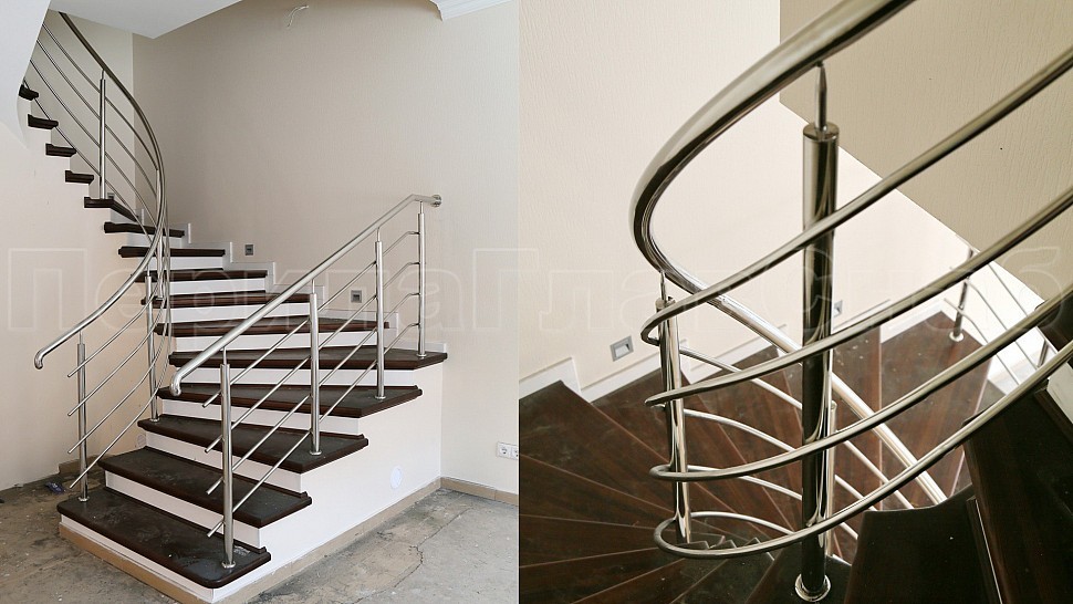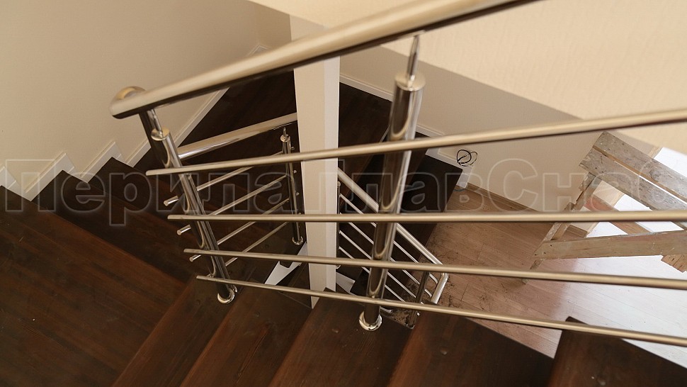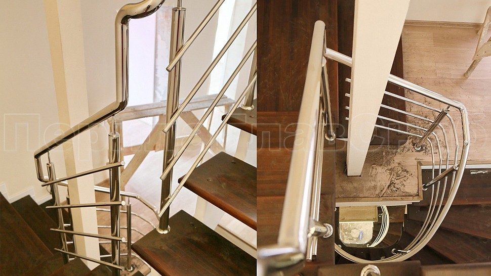Поручень диаметром 38,1 мм из прямых и радиусных участков прокатанных по месту на станке ( при прокатке поручень приобретает в сечении овальную форму). Крепление нержавеющих элементов ограждения между собой выполнено при помощи точечной аргонно-дуговой сварки, длина швов после нее — 2 мм, на финальном этапе монтажа швы были зачищены и отполированы.