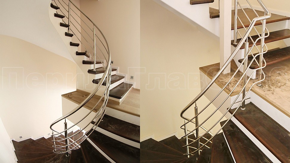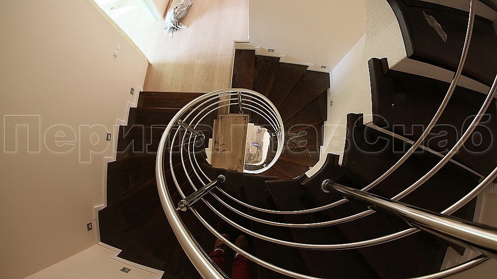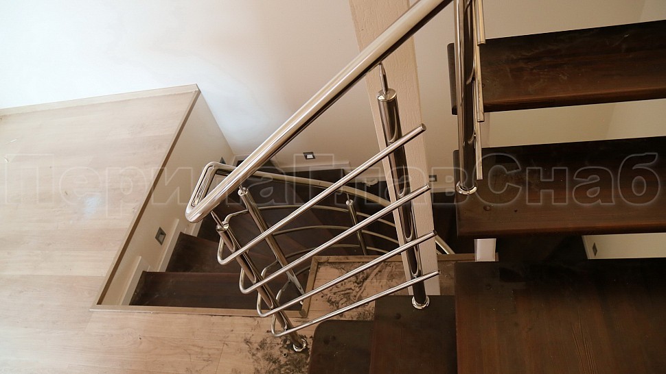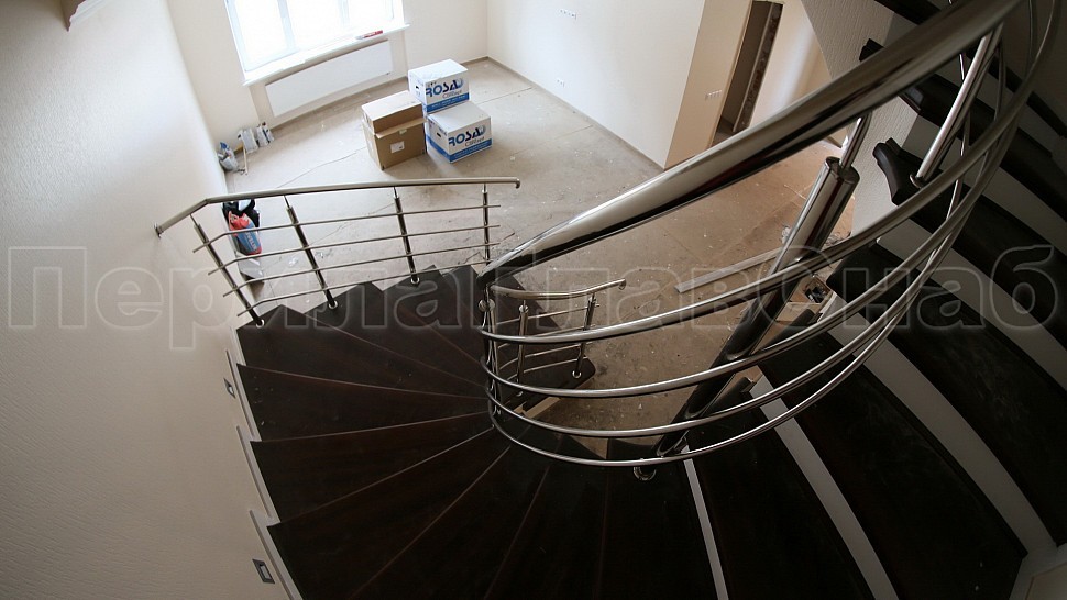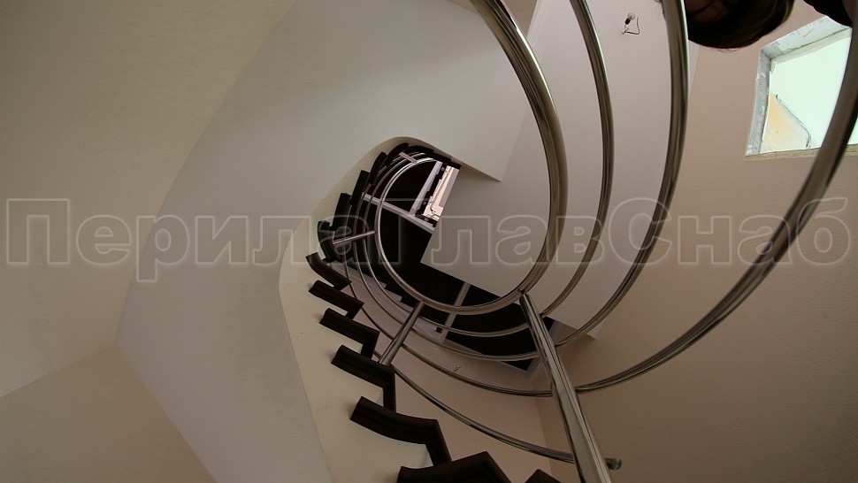 Заказчиком был одобрен предложенный нашими специалистами проект. Ограждение винтовой лестницы с первого по четвертый этаж выполнены из полированной нержавеющей стали с четырьмя ригелями, высотой 950 мм. Стойками диаметром 38,1 мм, низ стойки декоративный, ригель диаметром 16 мм, поручень полированная нержавеющая сталь диаметром 38,1 мм. Стойки устанавливаются в ступени с маршем сверху сквозь доску, фанеру в железобетон на шпильке с вклеиванием с шагом через две ступени на третью, в горизонте с шагом 900 -1200 мм.