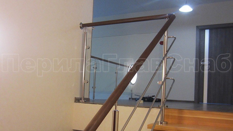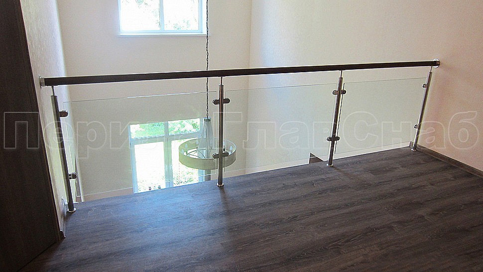 В частный дом было установлено ограждение из полированной нержавеющей стали со стеклом и стойками диаметром 38 мм, которые устанавливаются через две ступени на третью, крепятся сверху бурением с последующим вклеиванием, верх стойки штырь с ложементом для деревянного поручня. Закаленное прозрачное стекло 8 мм с полировкой кромок по периметру. Стекло крепится к стойкам на зажимных стеклодержателях из полированной нержавеющей стали.
