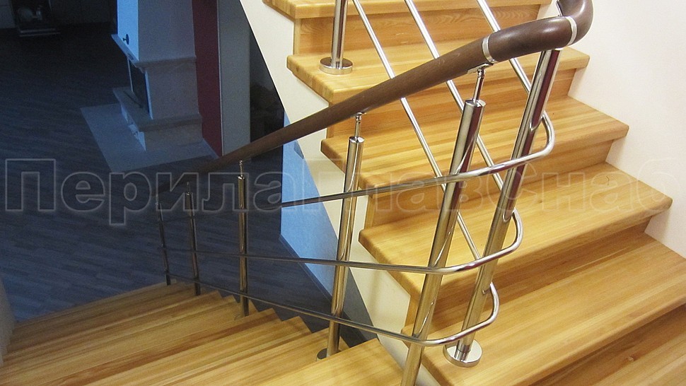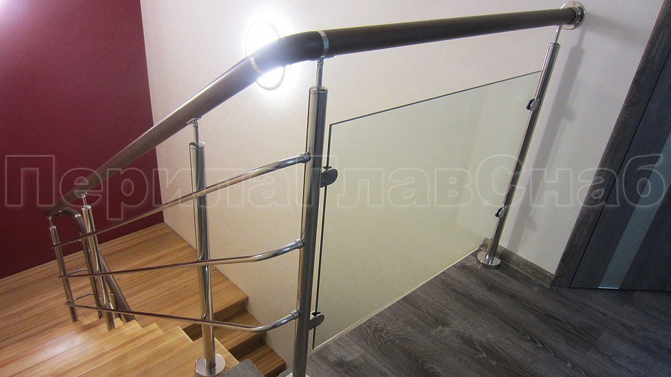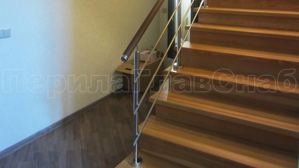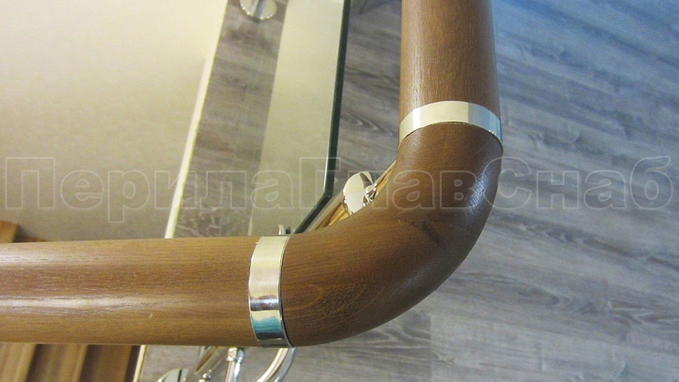Клееный дубовый поручень крепится над стойками. Окончание поручня заглушка из полированной нержавеющей стали. Поручень крепится к держателю поручня на саморезах с полукруглой головкой. Поручень завязан между маршами дубовыми отводами через нержавеющие кольца с круглыми проставками из дуба.
