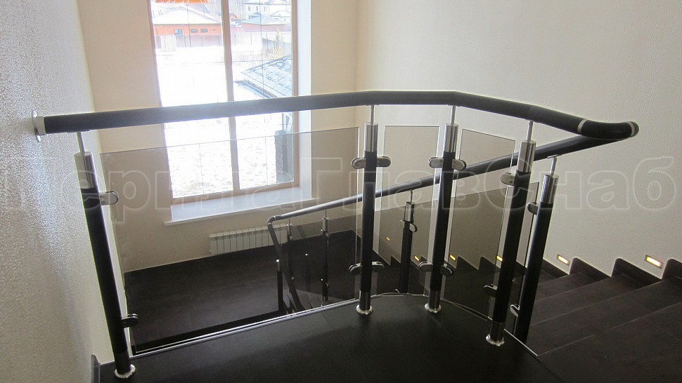 В загородный дом, было установлено лестничное ограждения высотой 950 мм с бронзовым каленым стеклом толщеной 8 мм, с деревянным поручнем диаметром 50 мм, стойки диаметром 50 мм из полированной нержавеющей стали с деревянными вставками устанавливаются через две ступени на третью. Верх стойки штырь, низ стойки декоративная крышка. Окончание поручня заглушка. Поручень завязан, свариваемые швы шлифуются и полируются до блеска. Наши лестницы и ограждения всегда найдут место в вашем доме. Впишутся в любой интерьер. Московская область, Солнечногорский район, д.Якиманское