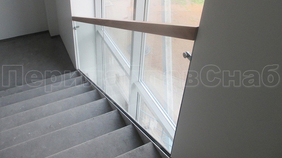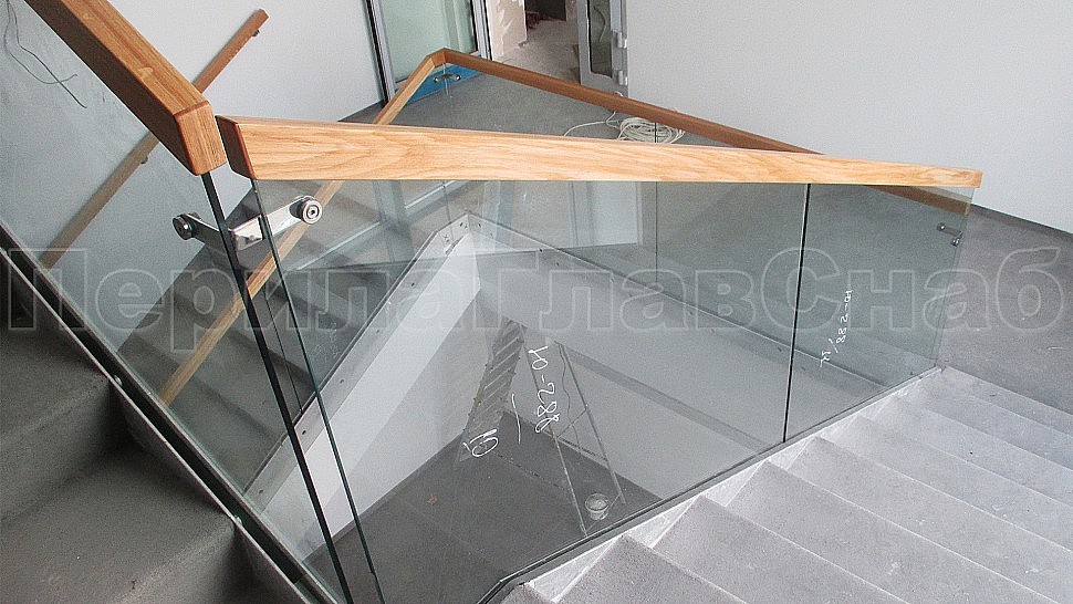 Лучшим решением в оформлении лестницы являются перила комбинированного вида. Такой заказ поступил к нам в компанию. Сочетание металла, дерева, стекла, которые обладают прекрасными декоративными свойствами. Они имеют высокую прочность и обеспечивают гармоничное вхождение в любой интерьер административного здания. Ограждение колодезной лестницы и площадок с прозрачным закаленным 10 мм стеклом и полировкой кромки по периметру с креплением в торец ступеней на нижнем зажимном алюминиевом профиле высотой 114 мм и шириной 44 мм. Высота ограждения с поручнем на стекле сверху 950 мм. Поручень дубовый клееный из сегментов сечением 40х60 мм с тонировкой в RAL и покрытый лаком. На поворотах поручень обрывается, между двух стекол в верхней части угловой соединитель из нержавеющей стали. На алюминиевый профиль с торца крепится накладка из полированной нержавеющей стали 1 мм.