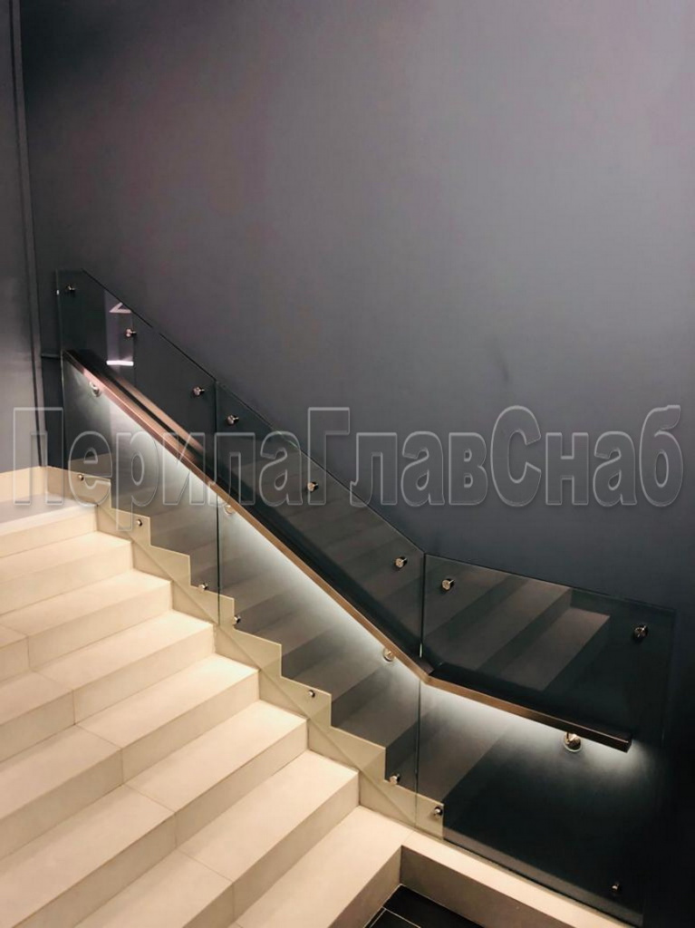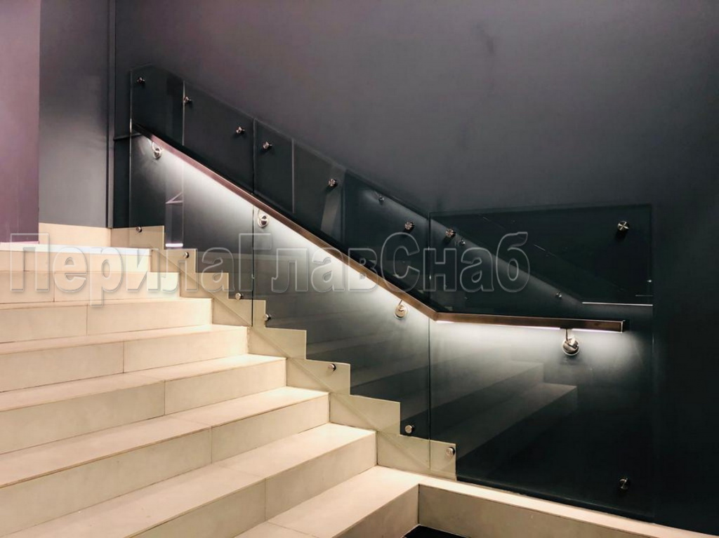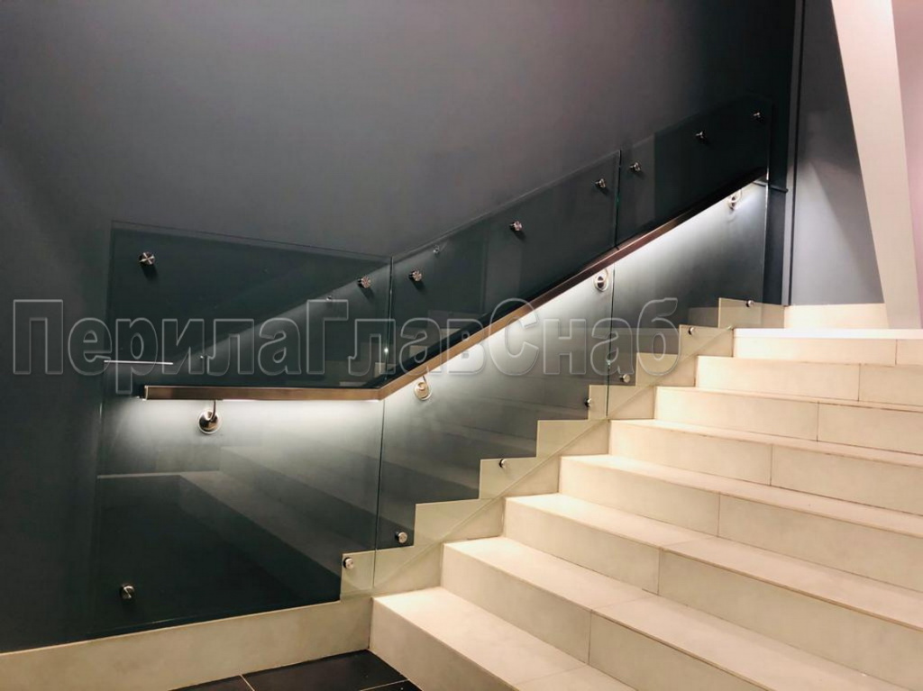Конструктив: профильная труба 40х40 мм с пазом и встроенной ЛЭД подсветкой, пристенные держатели, стекло