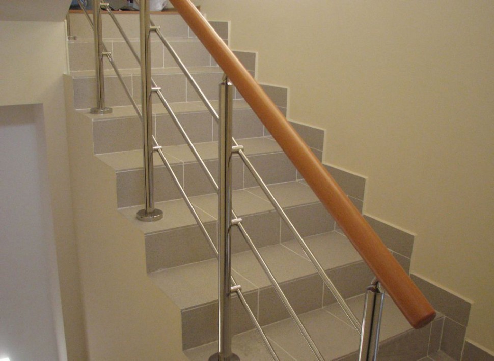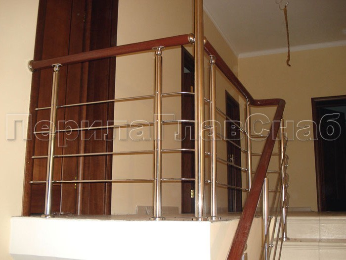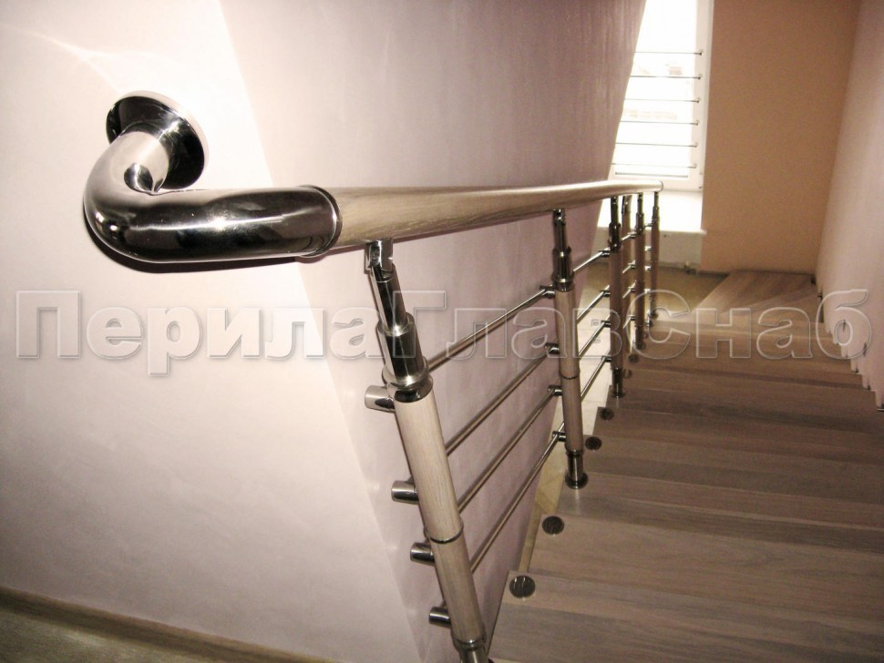 Нержавеющие ограждения без ригелей с круглым поручнем и стойками с деревянными вставками
