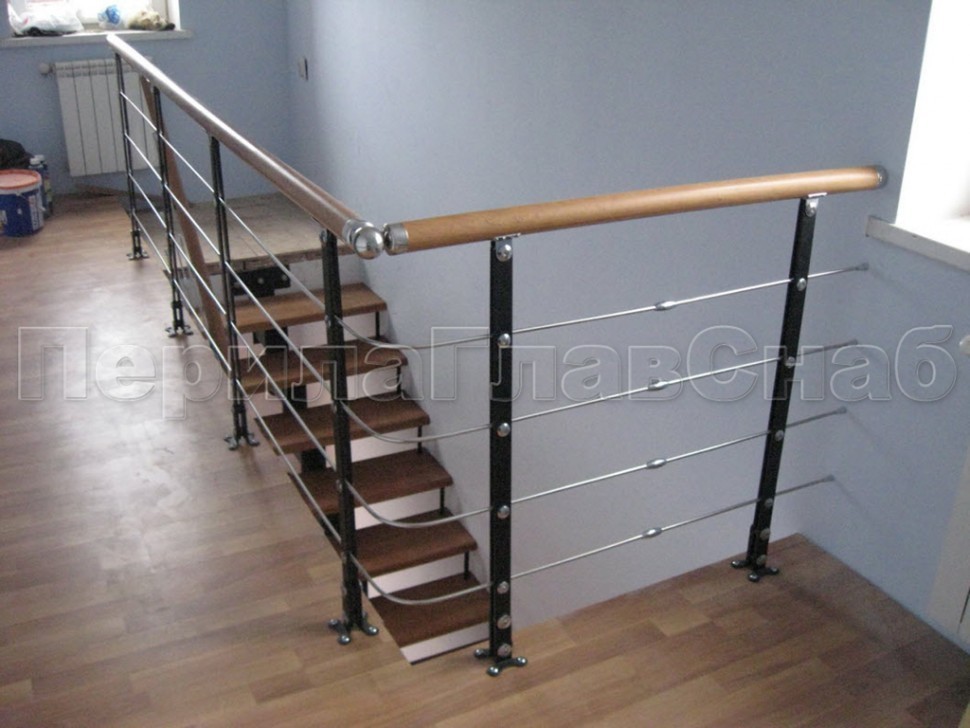 Три ригеля на сварке, квадратный деревянный поручень и круглые стойки