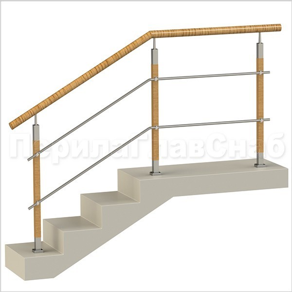 Два ригеля на держателях, круглый поручень и квадратные деревянные стойки