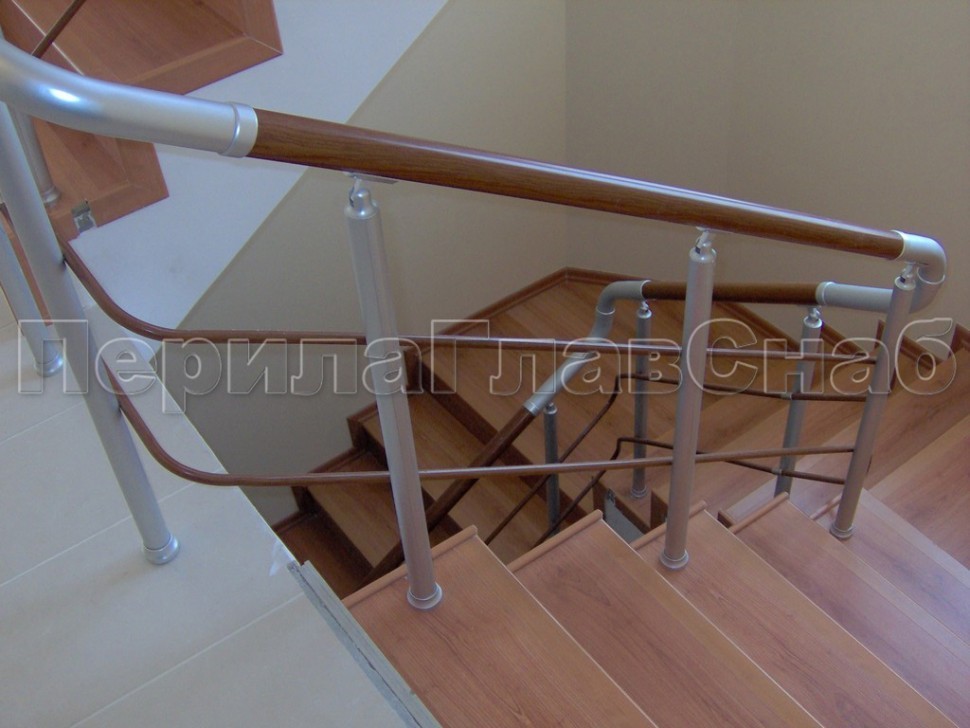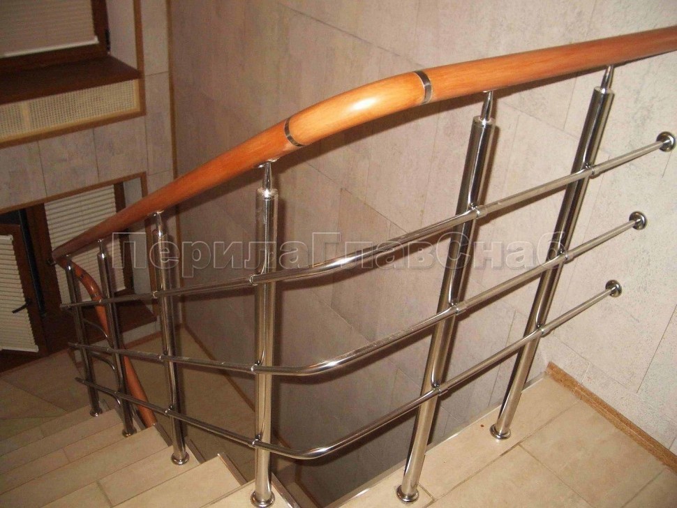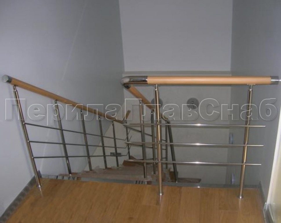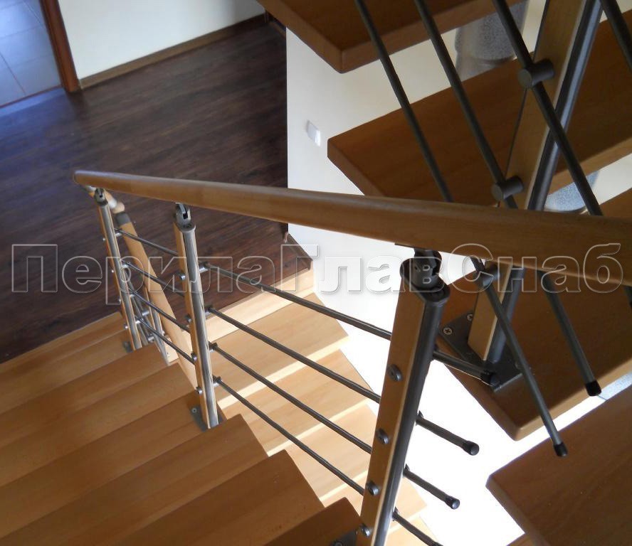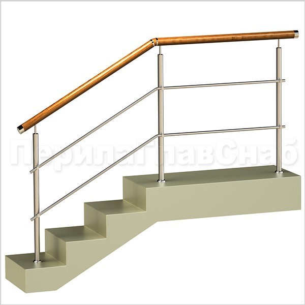Три ригеля на сварке, квадратный деревянный поручень и круглые стойки