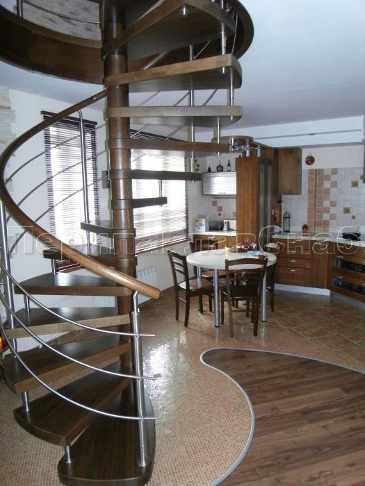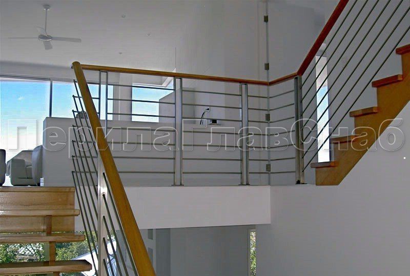 Нержавеющие ограждения без ригелей с круглым деревянным поручнем и стойками с деревянными вставками