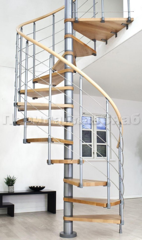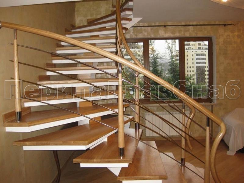 Ограждения со стойками в каждую ступень с круглым деревянным поручнем без ригелей