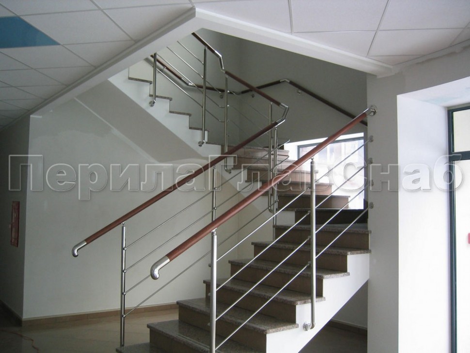 Четыре ригеля на держателях, круглый поручень и квадратные стойки