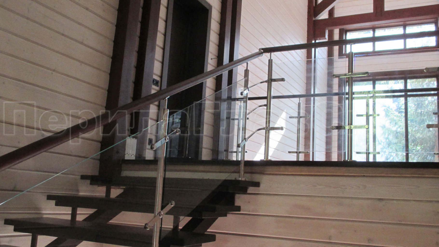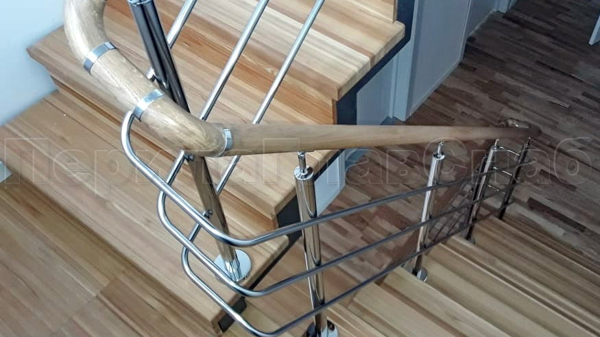 Нержавеющие ограждения без ригелей с круглым деревянным поручнем и стойками с деревянными вставками в Омске. Готовые проекты ПерилаГлавСнаб - фото 1