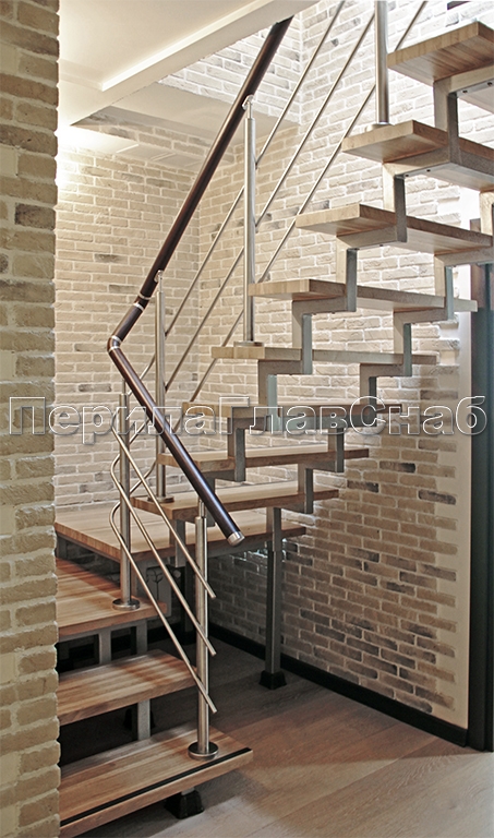 Четыре ригеля на сварке, квадратный деревянный поручень и круглые стойки