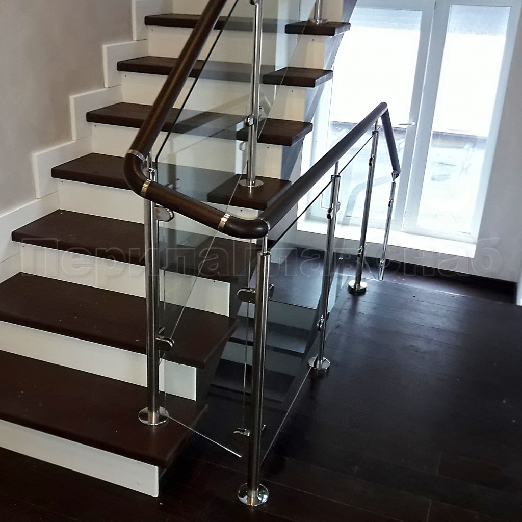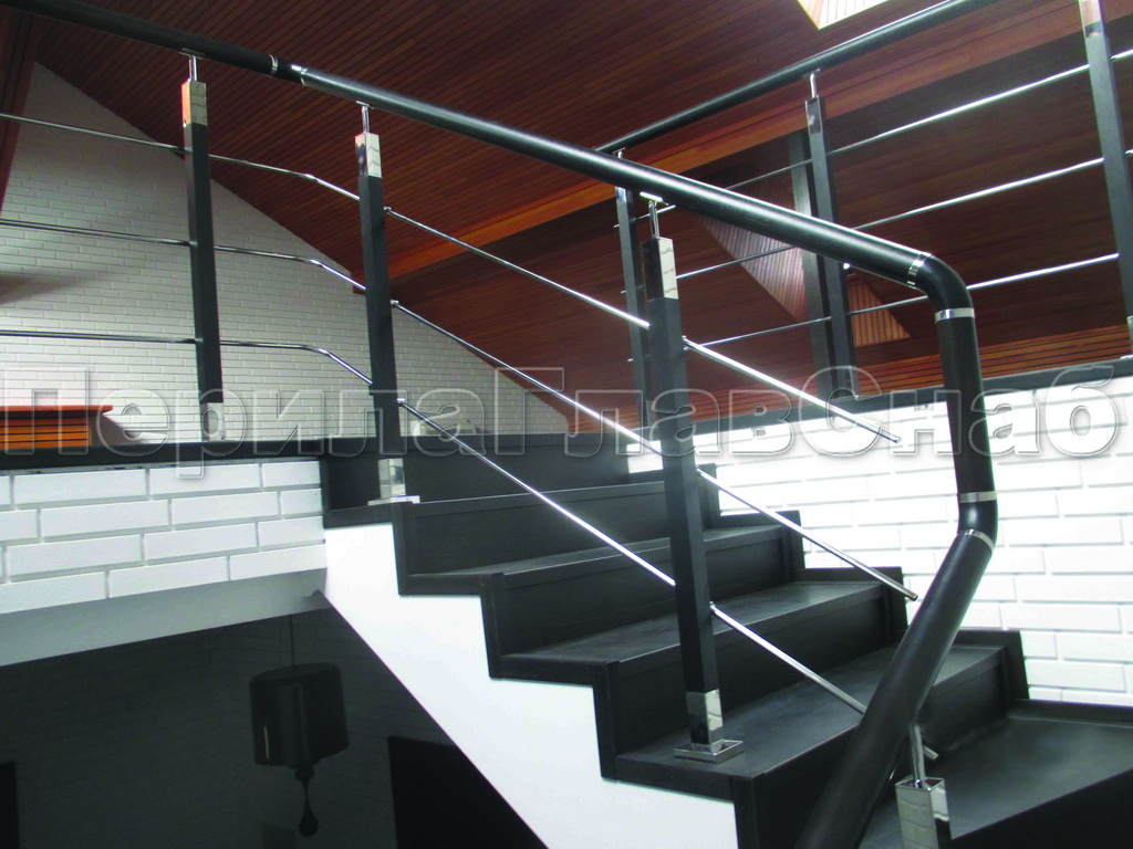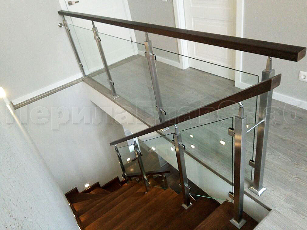Нержавеющие ограждения без ригелей с квадратным деревянным поручнем в Омске. Готовые проекты ПерилаГлавСнаб