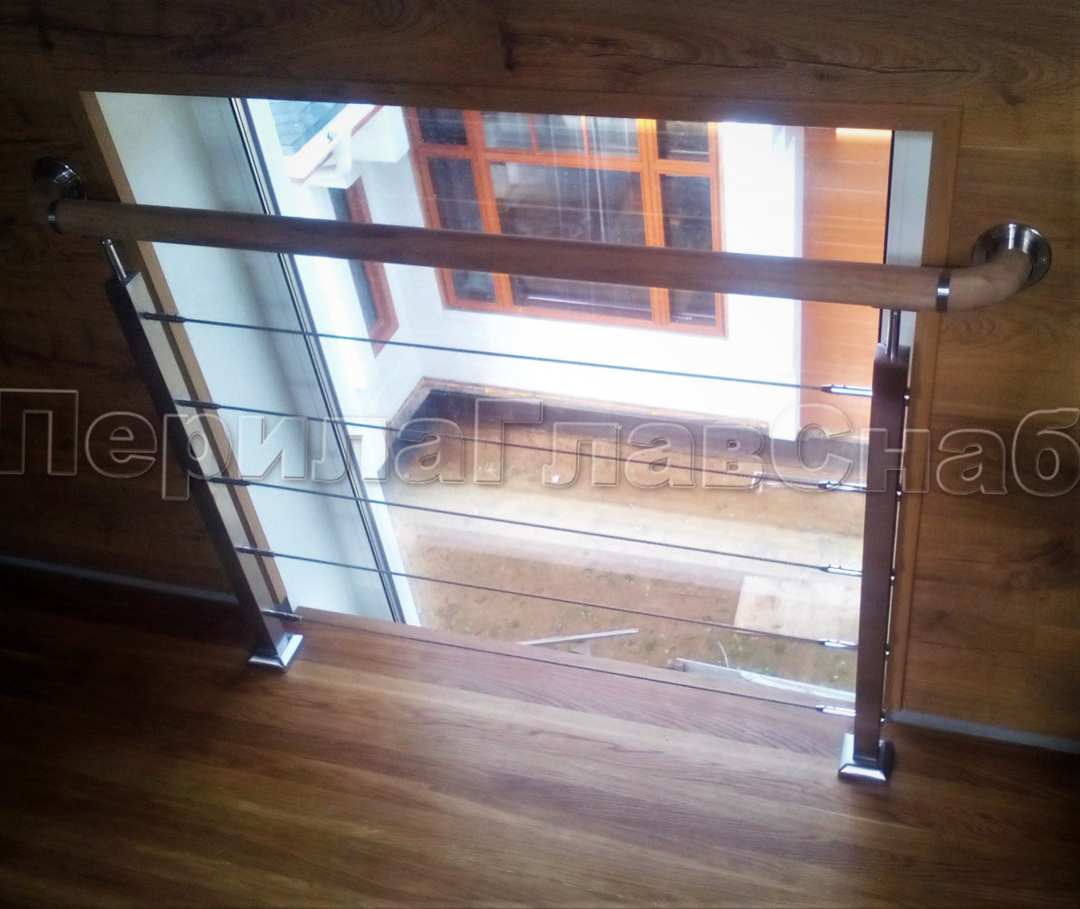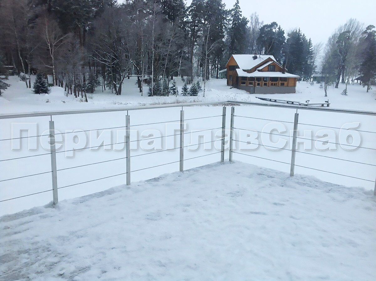 Ограждения из нержавейки. Заполнение из 4х тросиков. Квадратные стойки.