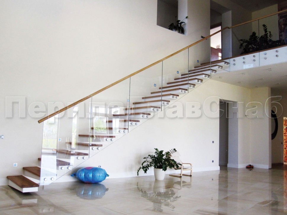 Ограждение с деревянным поручнем на выносе на точечном креплении на лестнице