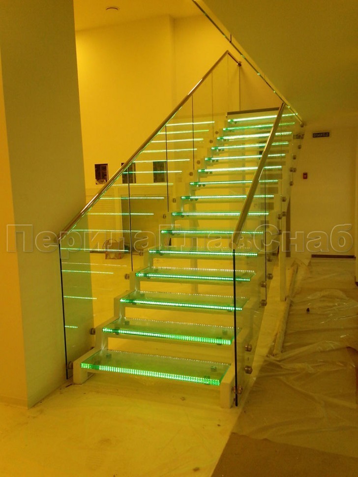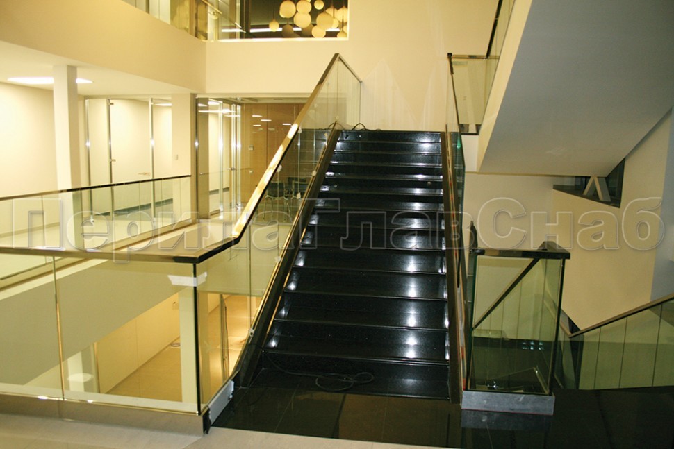 Ограждение с профильным поручнем с пазом на точечном креплении на лестнице