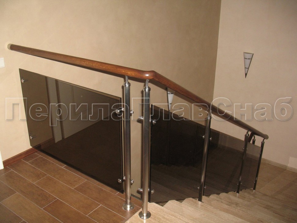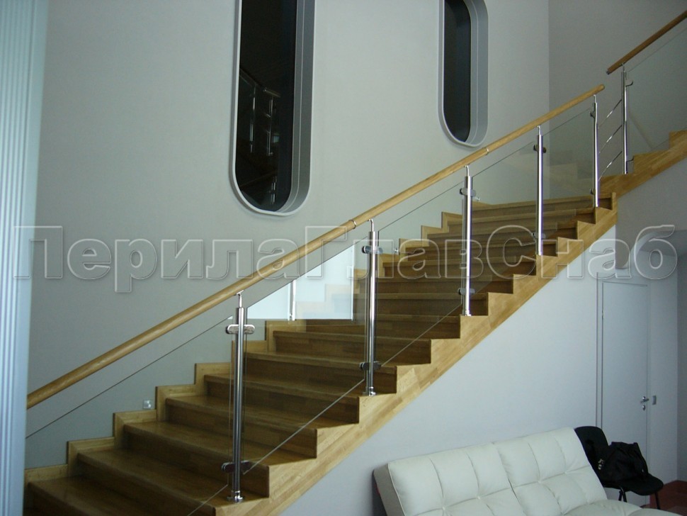 Ограждение с круглым деревянным поручнем с зажимными стеклодержателями и стойками с деревянными вставками
