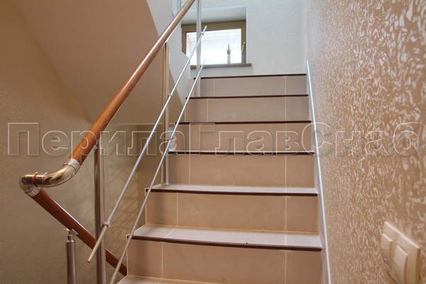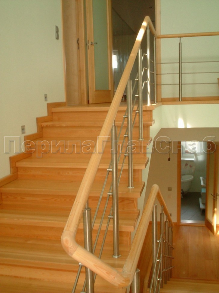 Нержавеющие ограждения без ригелей с круглым деревянным поручнем и стойками с деревянными вставками