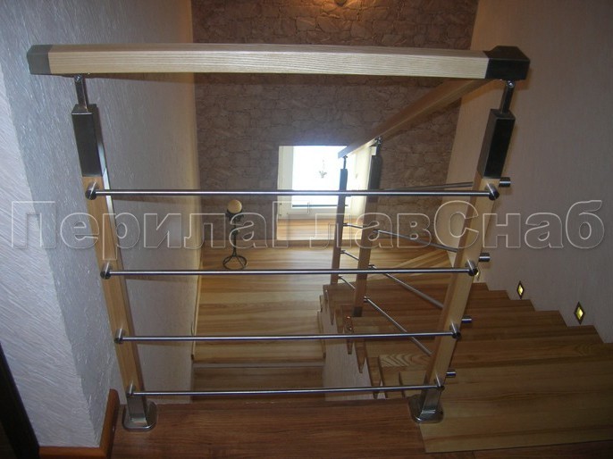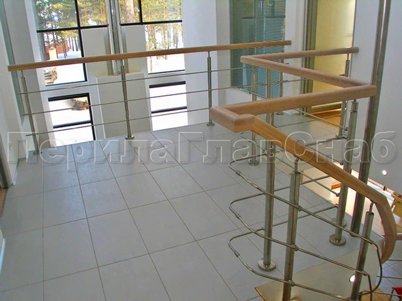Три ригеля на сварке, квадратный деревянный поручень и круглые стойки