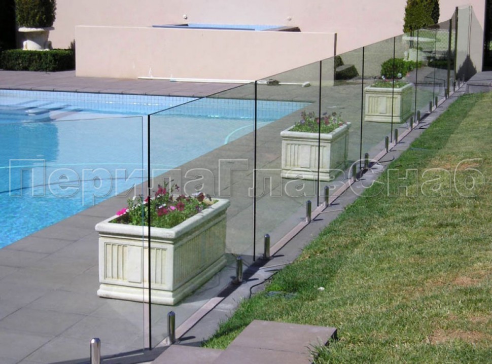 • Самый интересный вариант: установка защитного профиля на кромку стекла и специального выносного поручня.