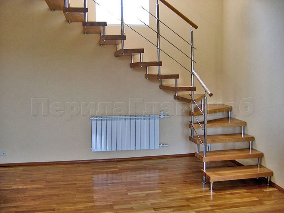 Ограждения с двумя стойками в каждую ступень с деревянным поручнем и без ригелей