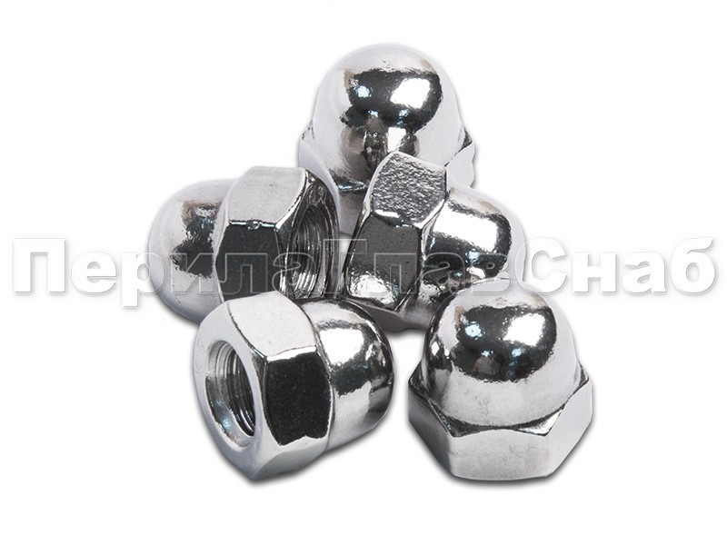 Гайка со сферической торцевой поверхностью и глухим резьбовым отверстием. Колпачок гайки защищает резьбу от механических повреждений и коррозии, повышает травмобезопасность, а также улучшает внешний вид соединения. Используется как декоративная закрытая часть крепления.
