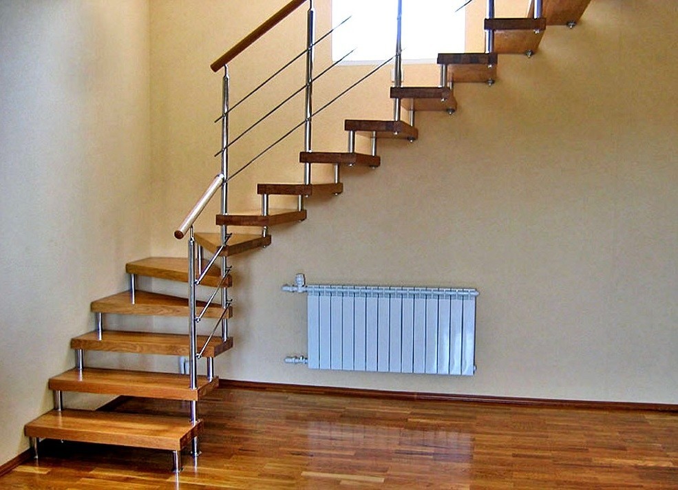 В основе конструкции первого типа лежат лестничные марши — непрерывные ряды ступеней и балок, соединенные воедино. Есть мнение, что именно такой вариант предпочтителен с точки зрения биомеханики — по такой лестнице удобно подниматься, опираясь на перила.