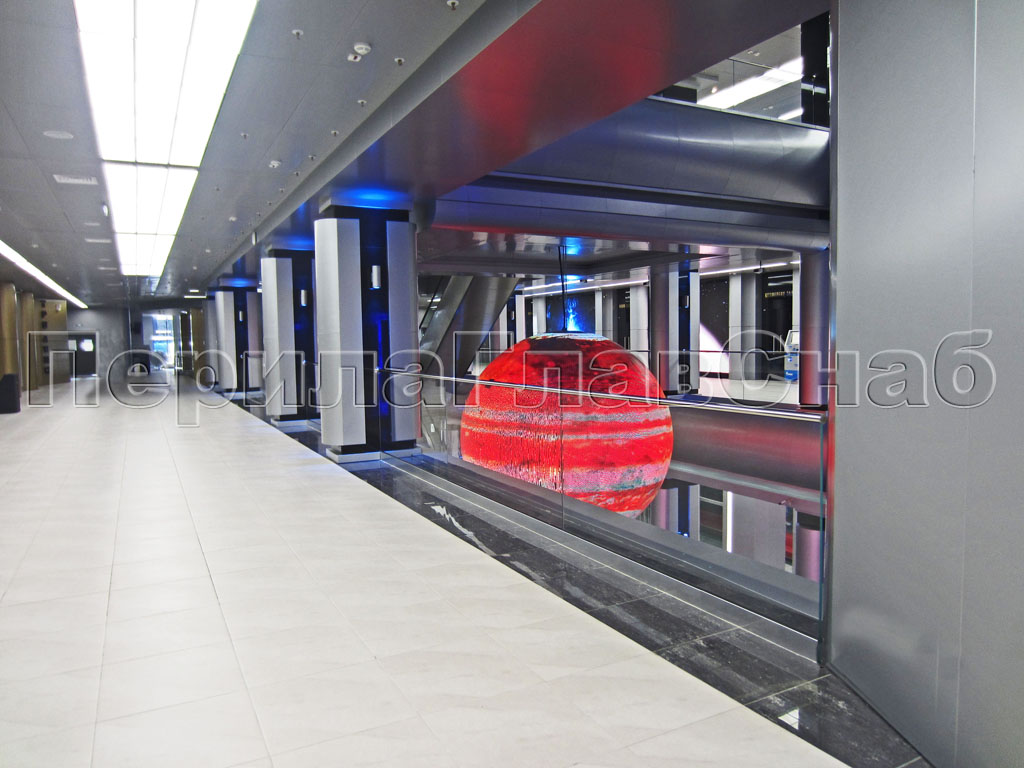 На этом же объекте на перилах для лестниц в качестве поручня установлена труба с пазом с подсветкой.