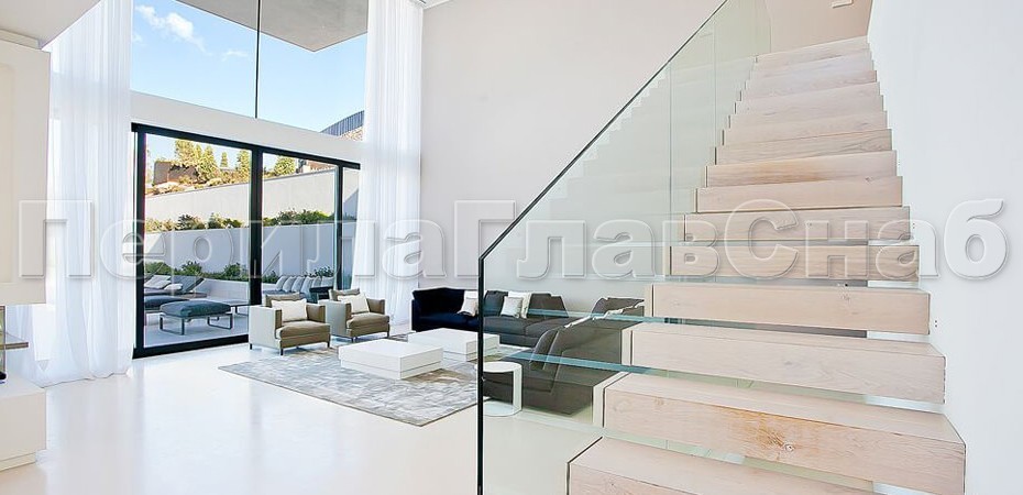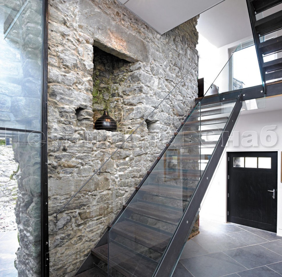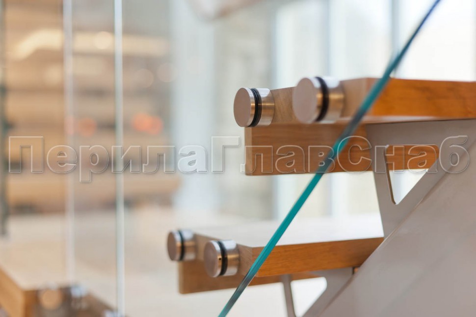 Ограждение с деревянным поручнем на точечном креплении на лестнице