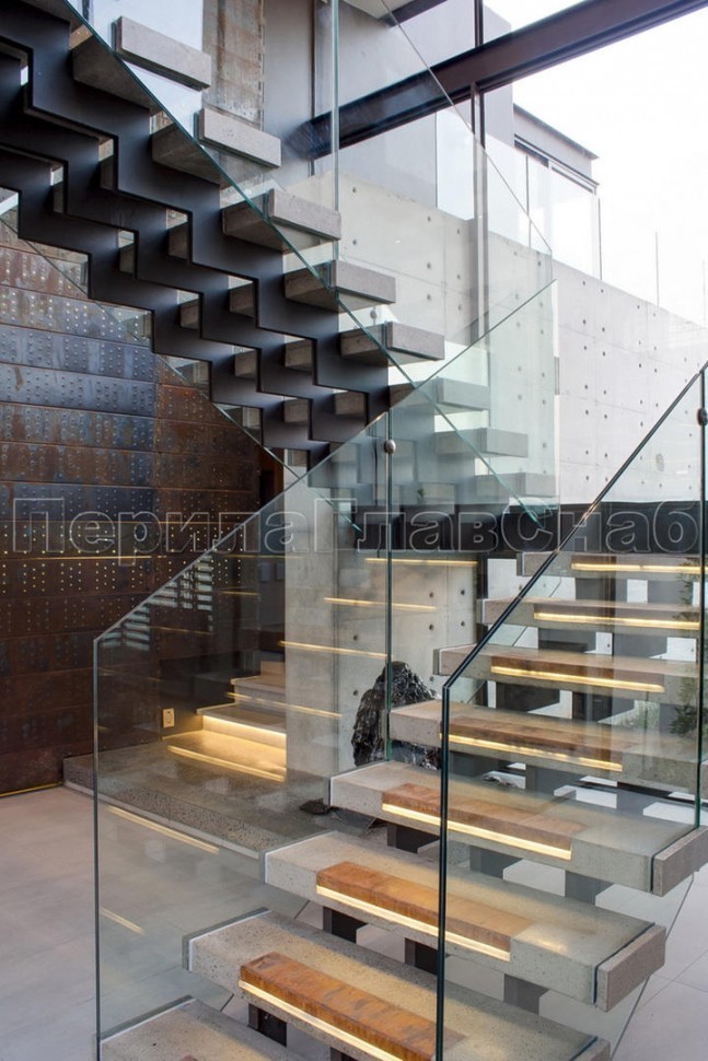 Ограждение с деревянным поручнем на выносе на точечном креплении на лестнице