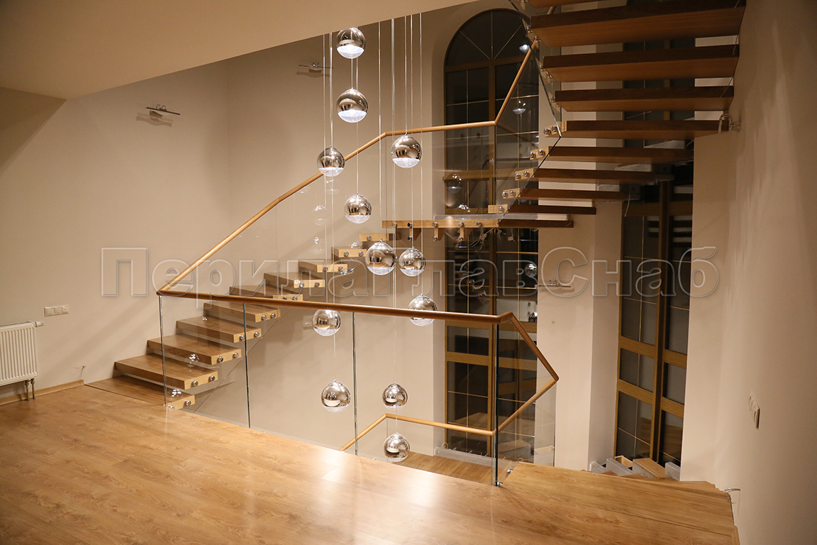 Стеклянные перила для забежной лестницы с дополнительным поручнем