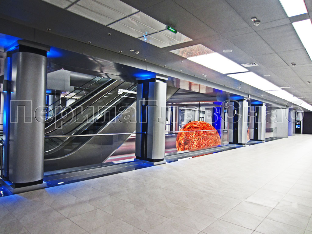 Фасад торгового центра полностью стеклянный, поэтому фронтальную часть ограждений входных групп заказчик попросил изготовить стеклянной на стойках. Эффекта прозрачности достигли путем использования 8-ми миллиметрового ультрапрозрачного стекла. Для стальных деталей перил использовали сталь тройной полировки AISI304L. Тройная полировка позволяет продлить срок жизни стальных ограждений.