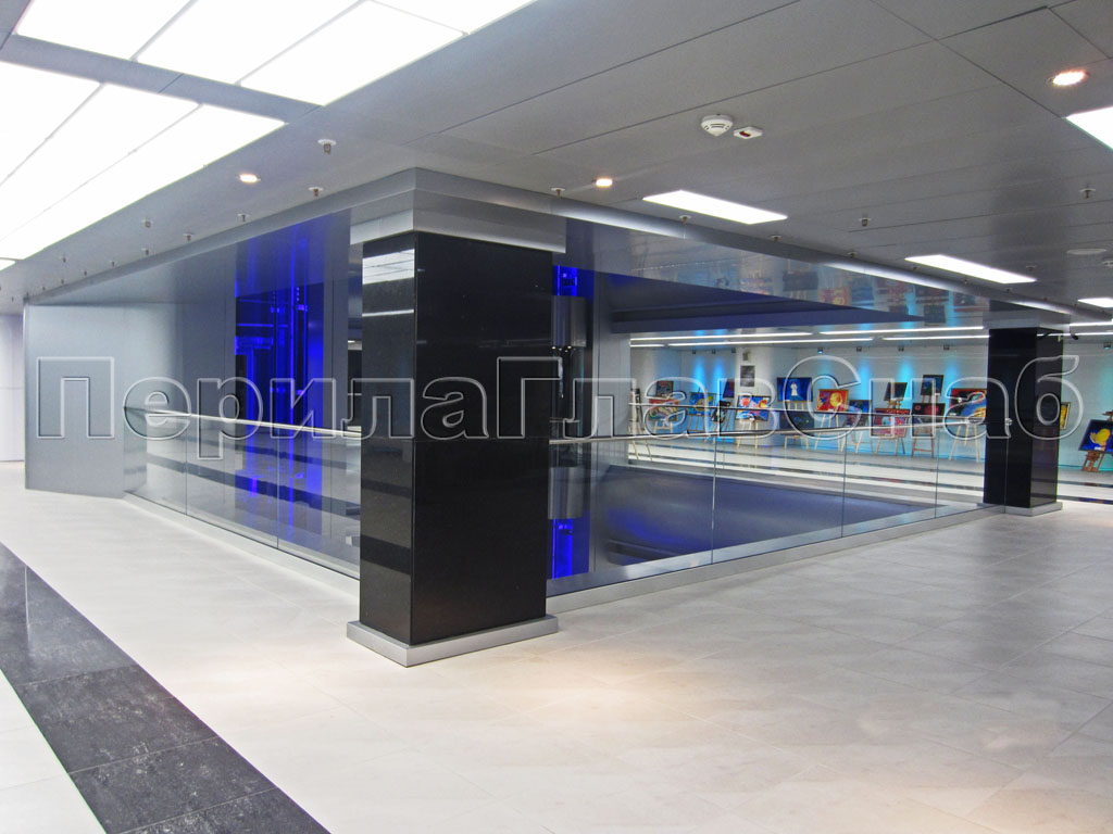 Несущее стекло для атриума установлено на алюминиевый анодированный профиль. Преимущества такого профиля в том, что он обладает зеркальным блеском, крепится на анкера и обладает огромной надежностью (выдерживает очень большие нагрузки и на разгиб). Для комфорта посетителей был использован поручень из трубы с пазом. Труба с пазом - идеальный поручень для несущего стекла,удобна в эксплуатации, а так же защищает кромку стекла.